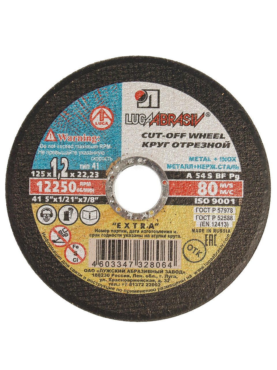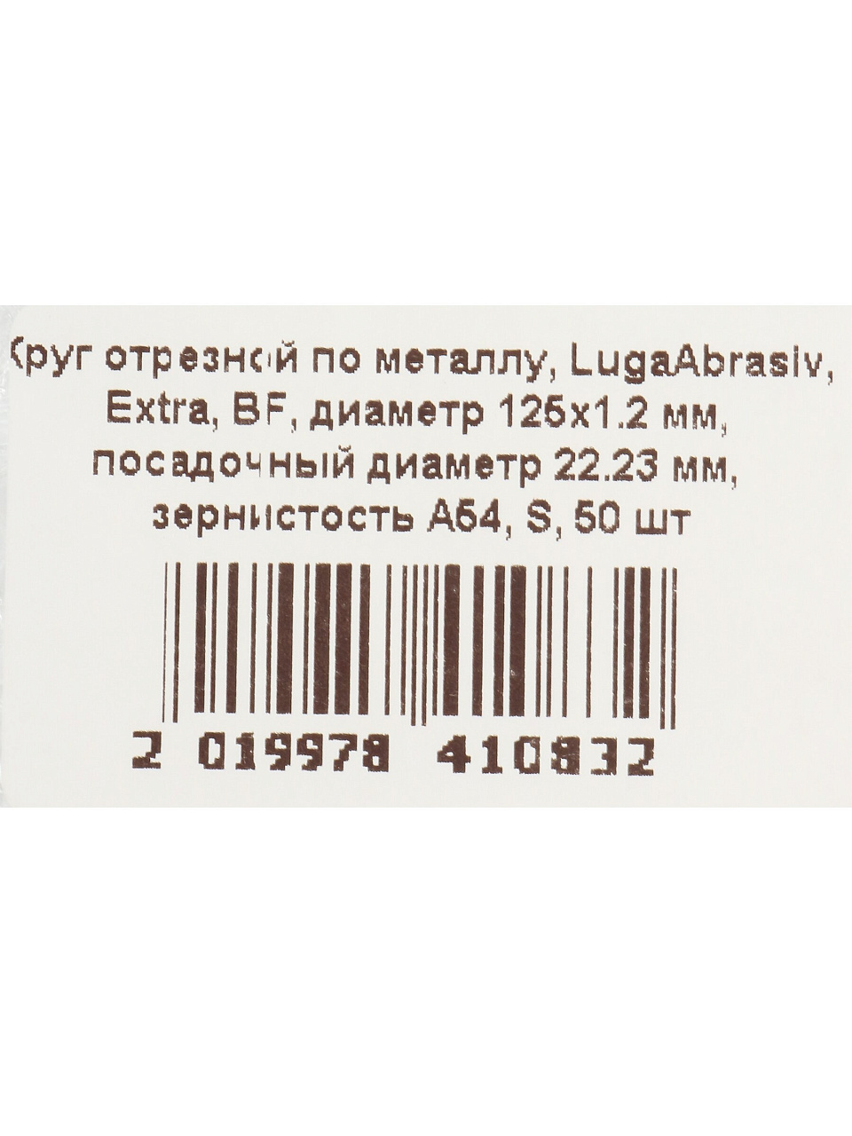 Вы можете приобрести «Круг отрезной по металлу, LugaAbrasiv, Extra, BF, диаметр 125х1.2 мм, посадочный диаметр 22.23 мм, зернистость A54, S, 50 шт» и другие товары в нашем интернет-магазине в Тамбове по низким ценам и с бесплатным самовывозом.