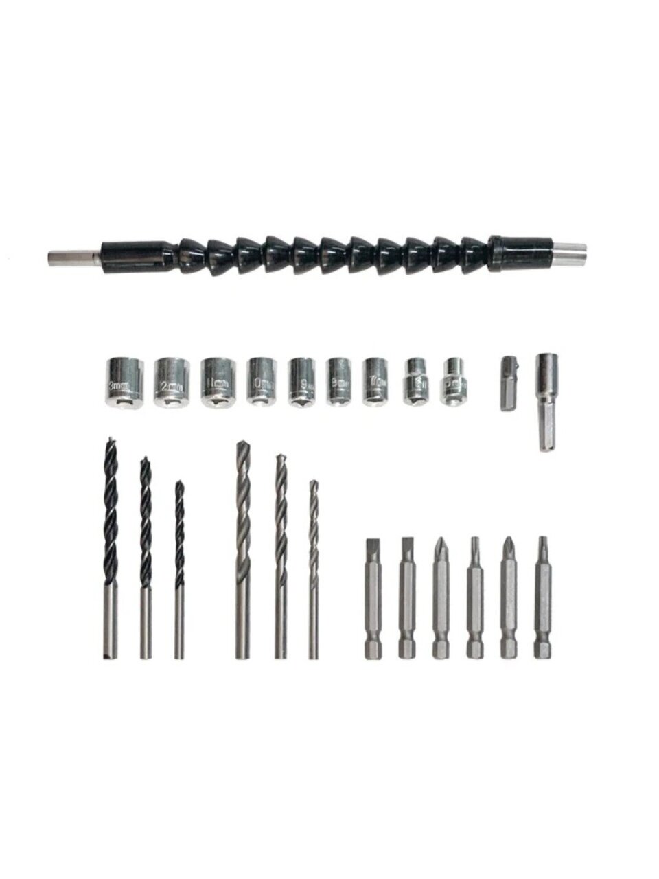 В комплект входят все необходимые аксессуары для начала работы: зарядное устройство, гибкий удлинитель, переходник для торцевых головок, кейс, 6 бит, 3 сверла по дереву, 3 сверла по металлу, 9 торцевых головок – все это позволяет значительно расширить возможности использования инструмента.