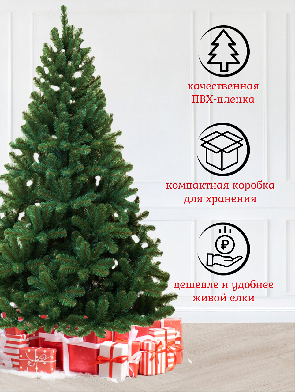 - Максимальная густота: 1436 веток, хвоя из ПВХ пленки — выглядит как живая сосна, не осыпается, сохраняет форму весь сезон.