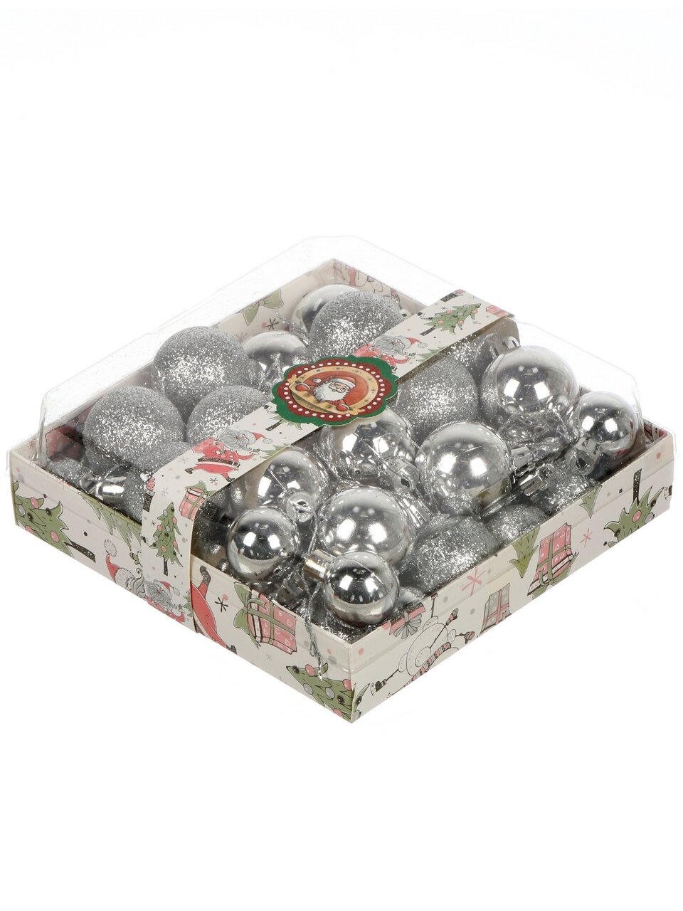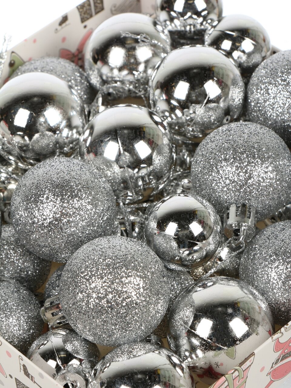 В комплекте 42 серебристых шара диаметром от 3 до 4 см, что удобно для оформления ёлки любого размера или создания праздничных композиций.