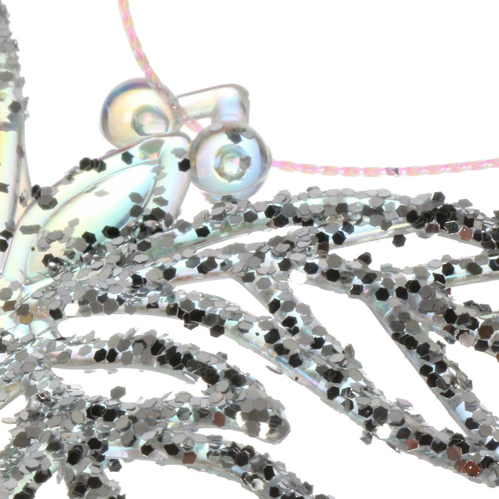 Размер — 10×12 см, цвет — прозрачный с серебряными блестками. Подходит для елок среднего и большого размера, крепится на подвеске.