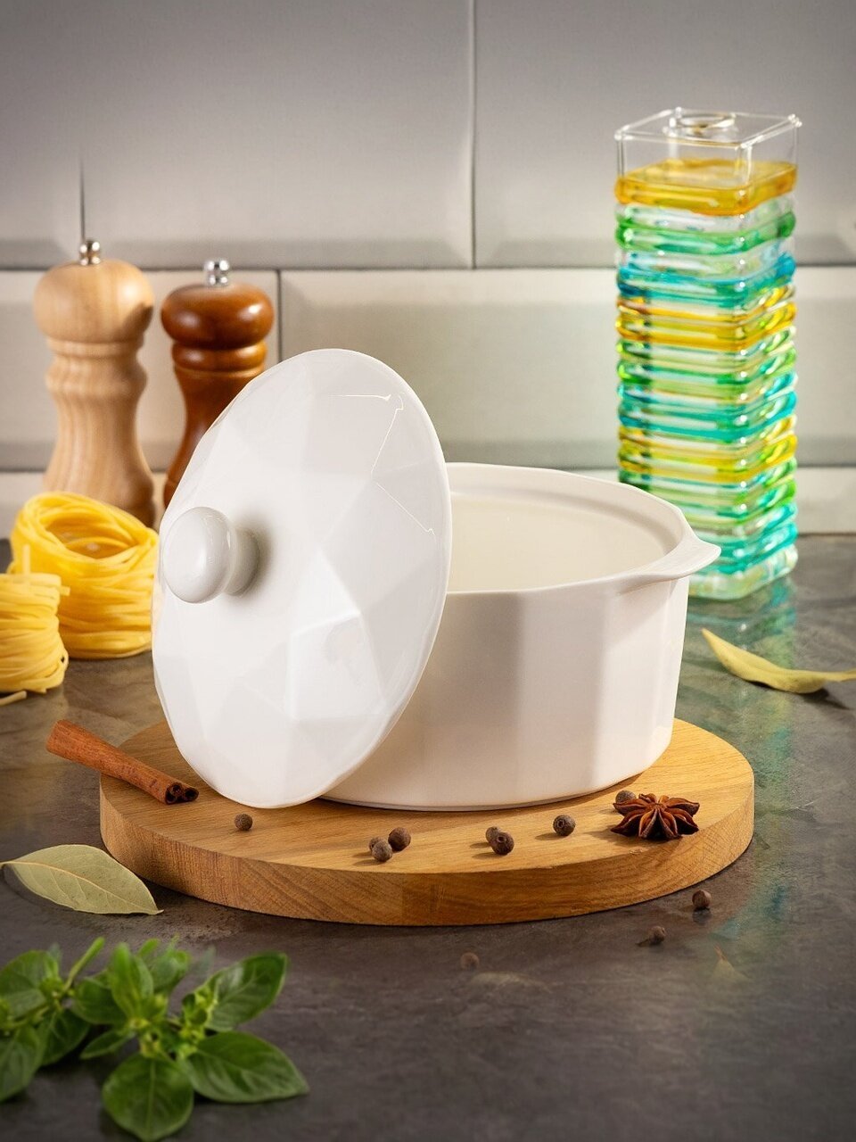 Керамическая кастрюля для запекания 1.3 л с крышкой «Антарктида» — идеальный выбор для тех, кто ищет универсальную посуду для духовки и СВЧ: готовьте вкусно, подавайте эффектно, легко мойте.