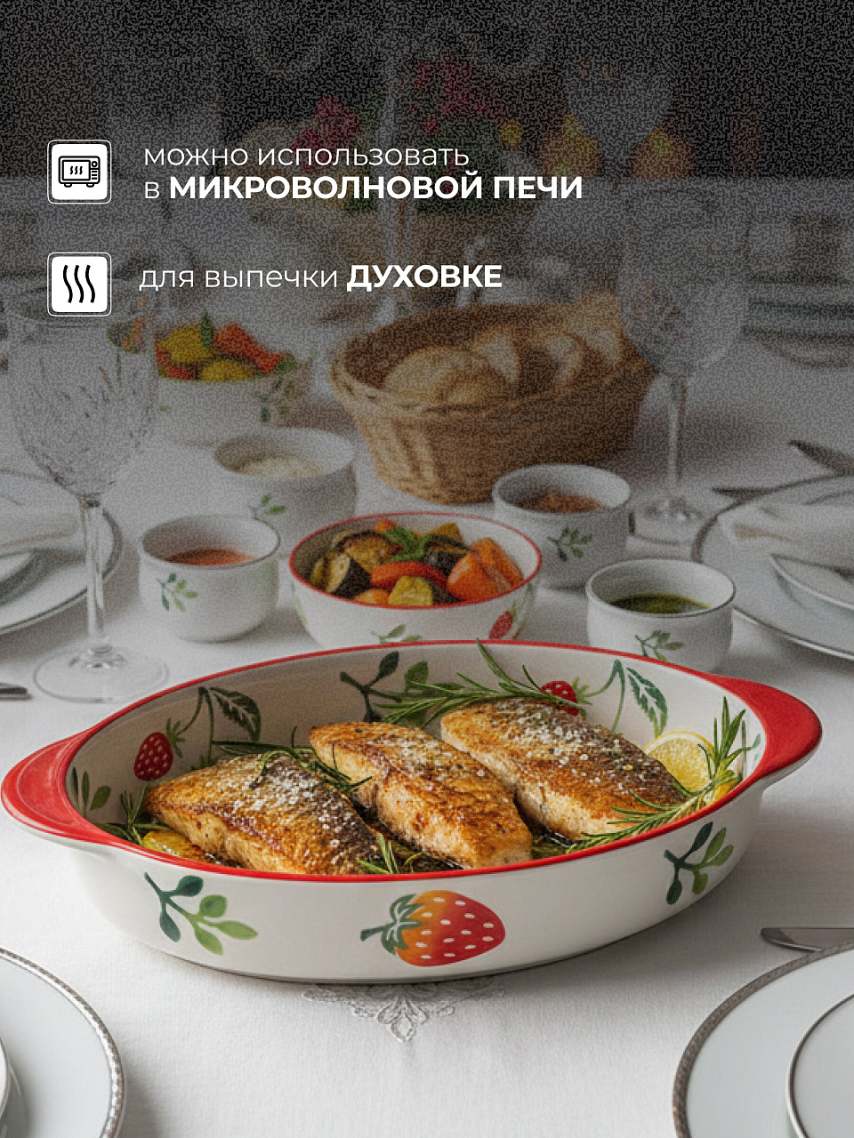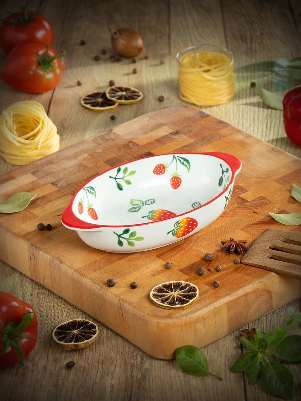 Овальная керамическая форма для запекания 23х13.5 см «Клубника» — стильное решение для пирогов, мяса и выпечки. Жаропрочная посуда для духовки и СВЧ по выгодной цене.