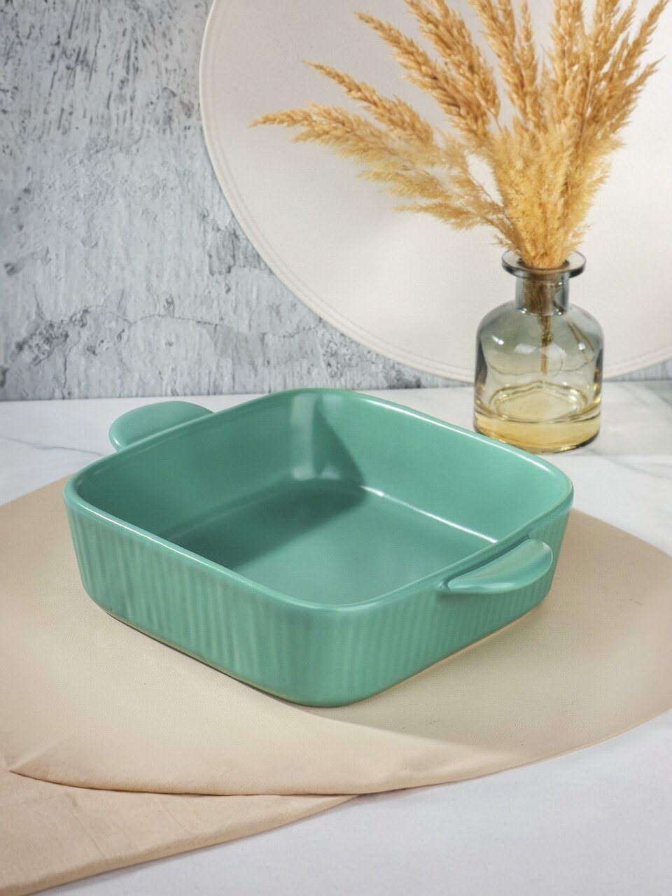 Многие спрашивают: «Как выбрать форму для запекания?» и «Подходит ли она для СВЧ?». Эта модель универсальна — её можно использовать в микроволновке, духовке, а после готовки легко мыть в посудомоечной машине. Бирюзовый цвет добавит яркий акцент интерьеру. Если сравнивать с формами из стекла или силикона, керамика лучше держит тепло и не теряет внешний вид со временем.
