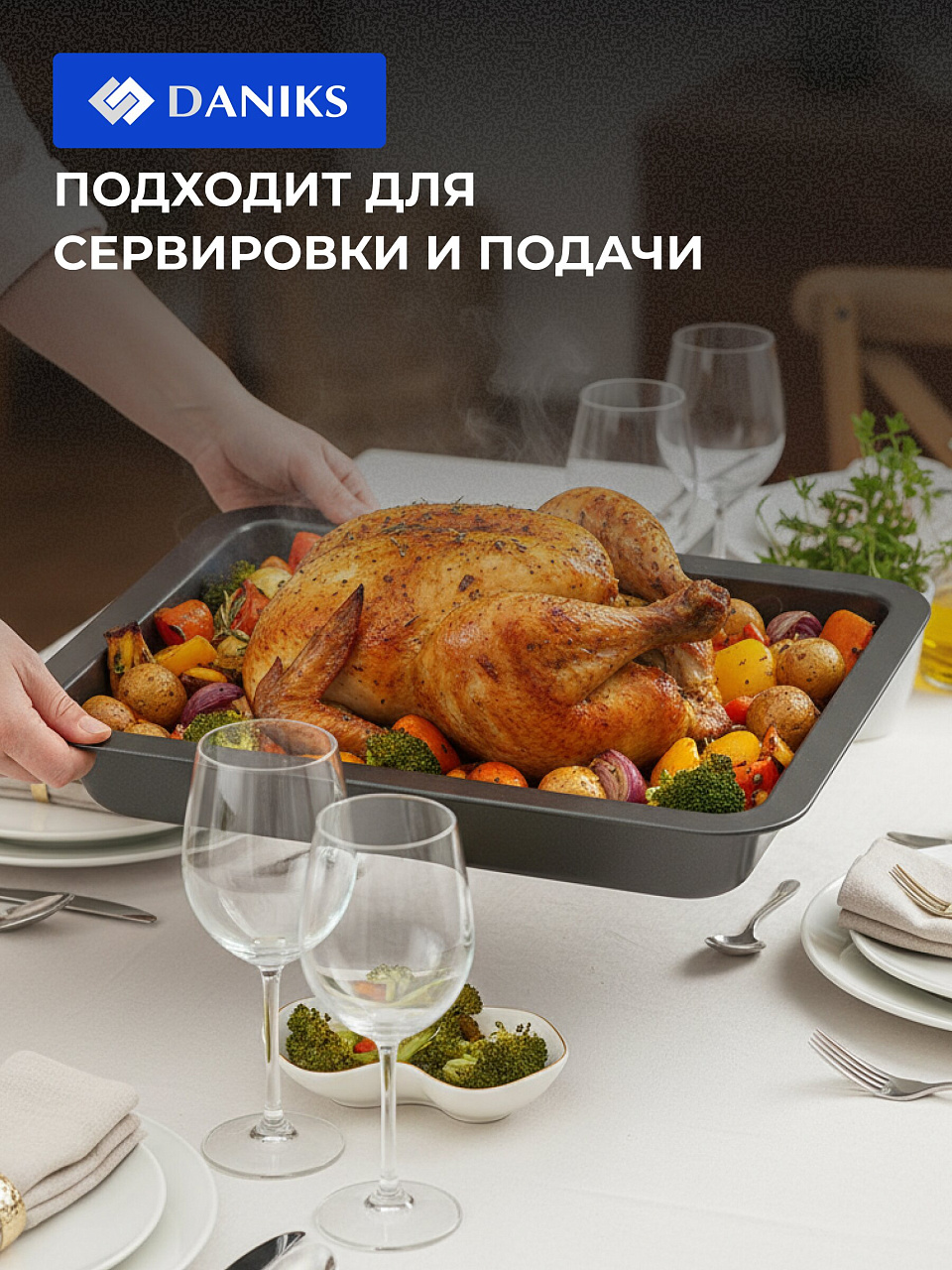 Для курицы оптимально использовать форму размером 34×24×4.5 см, которая входит в набор. Благодаря жаропрочной стали и антипригарному покрытию блюдо легко извлекается и не пригорает.