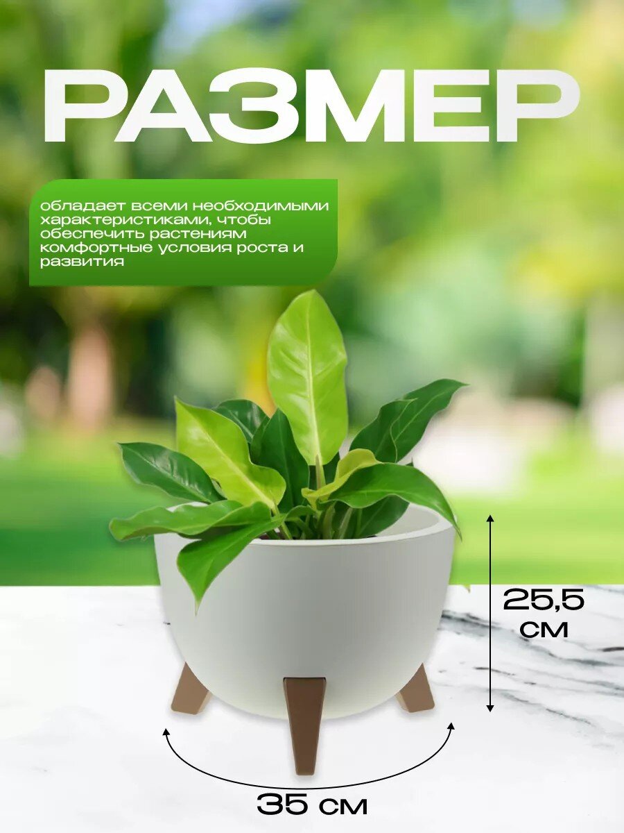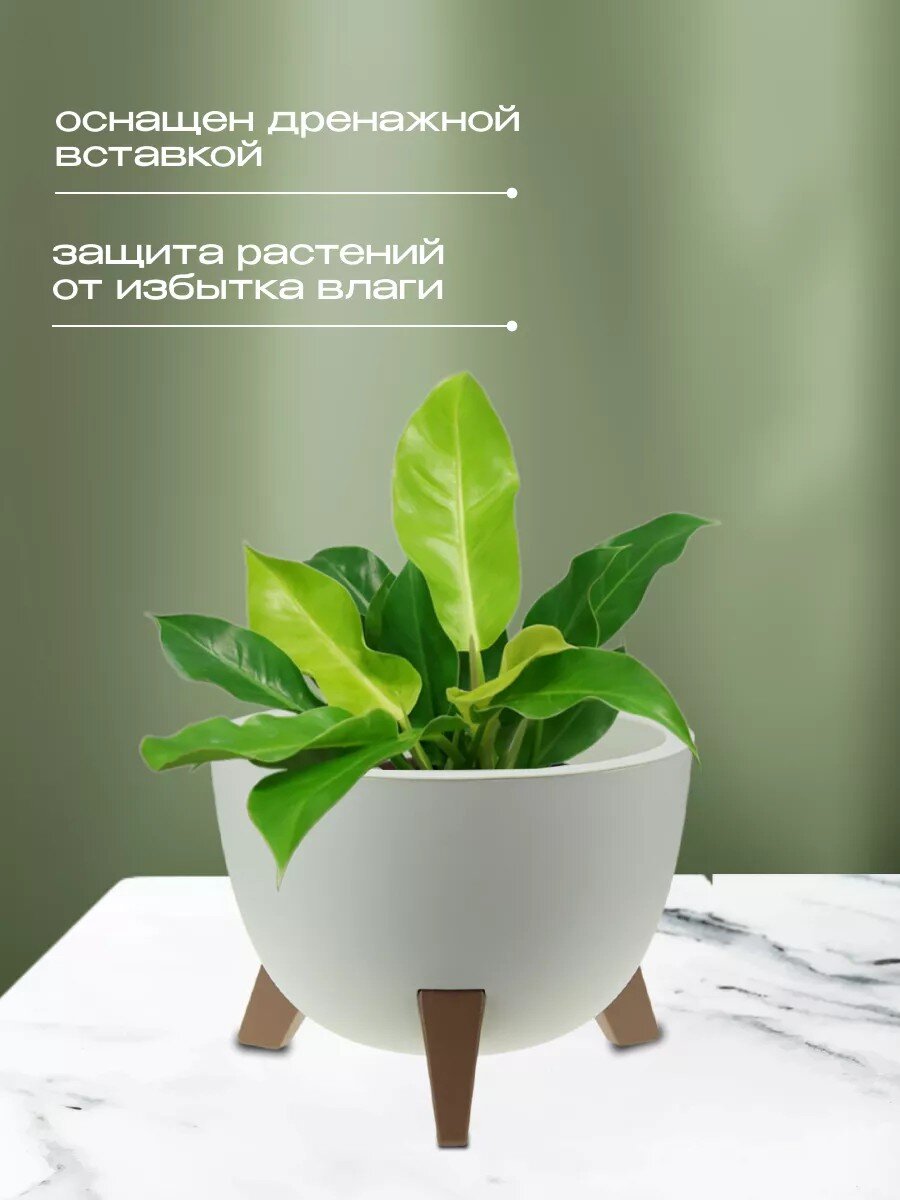 Кашпо со вставкой на ножках имеет круглую форму и матовую поверхность.
