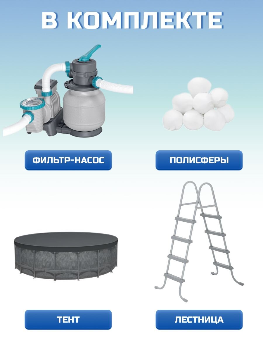Вы можете приобрести «Бассейн каркасный Bestway, 610х132 см, 561KE, фильтр-насос, лестница, тент, 33240 л, полисферы» и другие товары в нашем интернет-магазине в Обнинске по низким ценам и с бесплатным самовывозом.