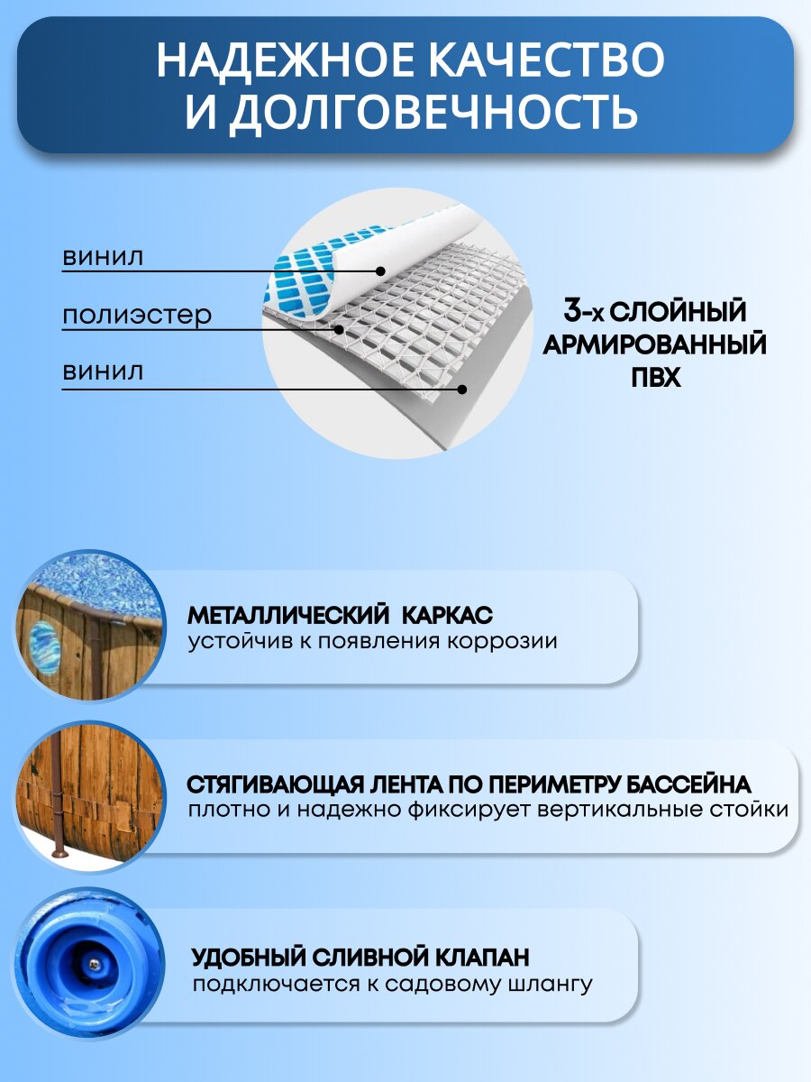 - Большой диаметр 488 см и глубина 122 см, прочная чаша из трёхслойного ПВХ и усиленный стальной каркас — надёжность и долговечность