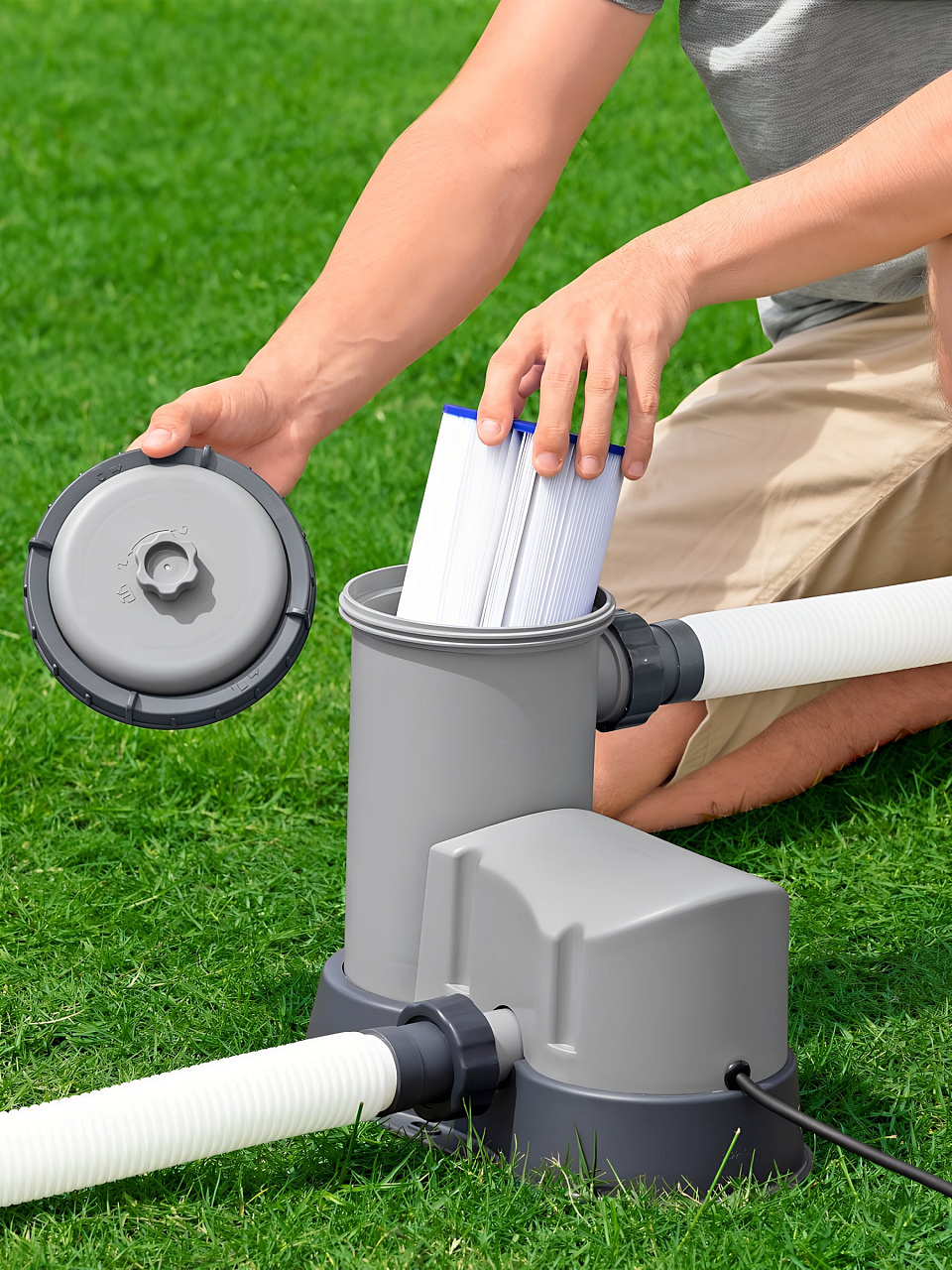 Монтаж занимает около 60 минут. Для подключения фильтра и сборки каркаса не требуется специальных инструментов — все необходимые элементы идут в комплекте.