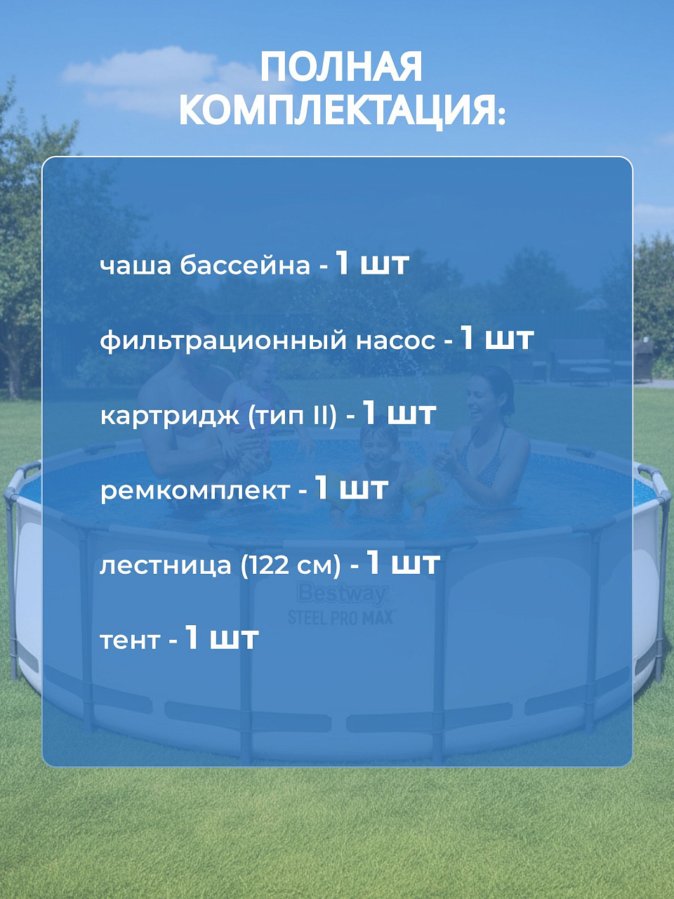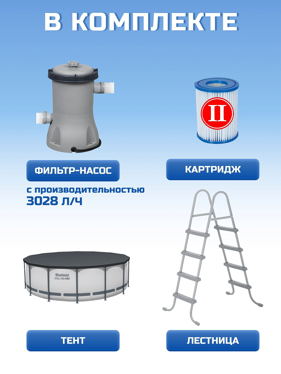 - В комплекте идет фильтр-насос с производительностью 3028 л/ч, обеспечивающий чистоту воды.