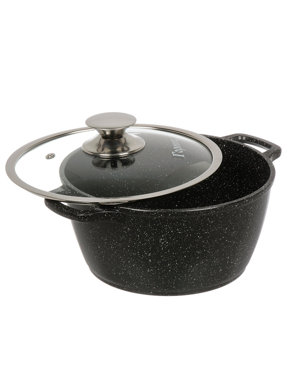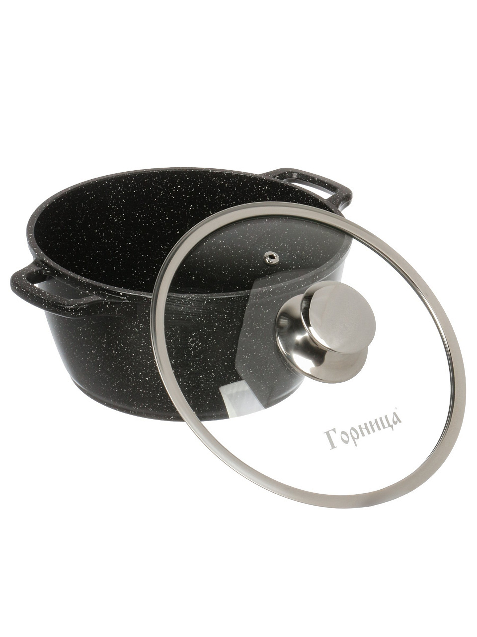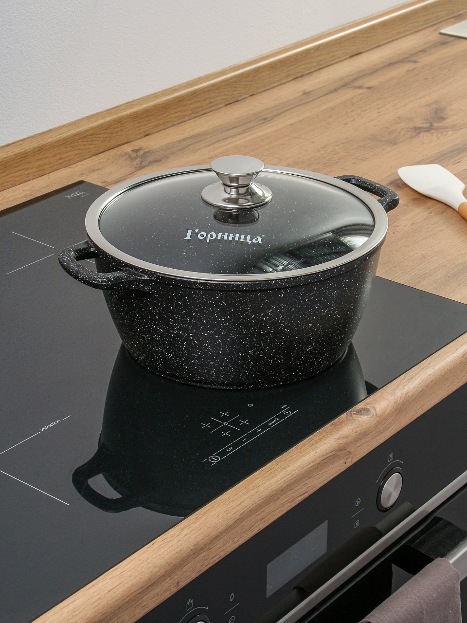 Алюминиевая кастрюля Горница Гранит Induction 3 л — идеальный выбор для индукционных плит: антипригарное покрытие, стеклянная крышка, литые ручки, универсальность для дома и дачи.