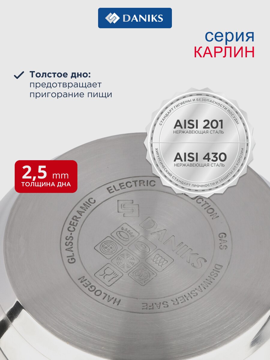 Кастрюля Daniks Карлин 4.5 л из нержавеющей стали: готовьте супы, каши и пасту без пригорания и хлопот. Подходит для индукции и любых плит.