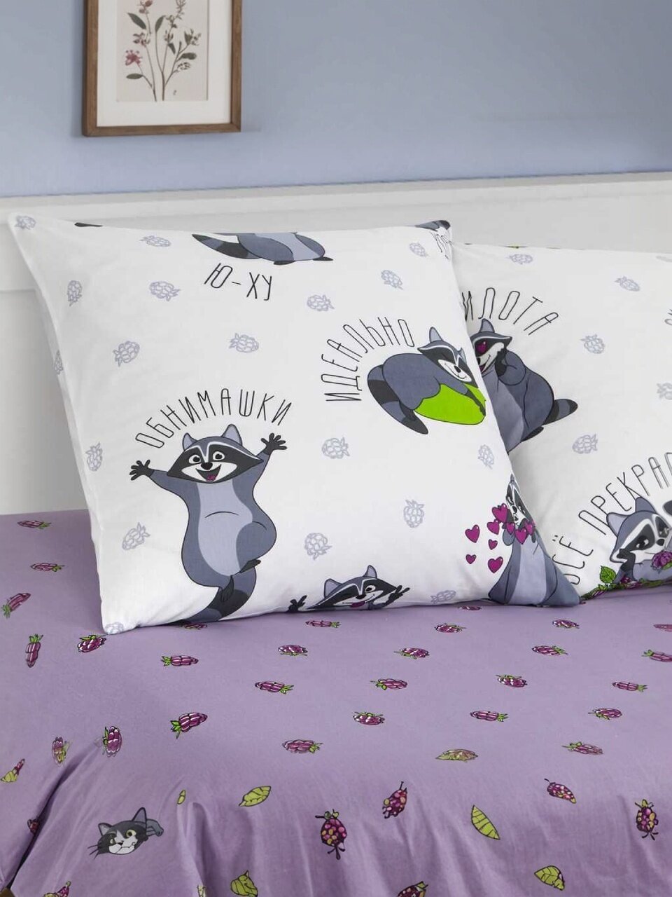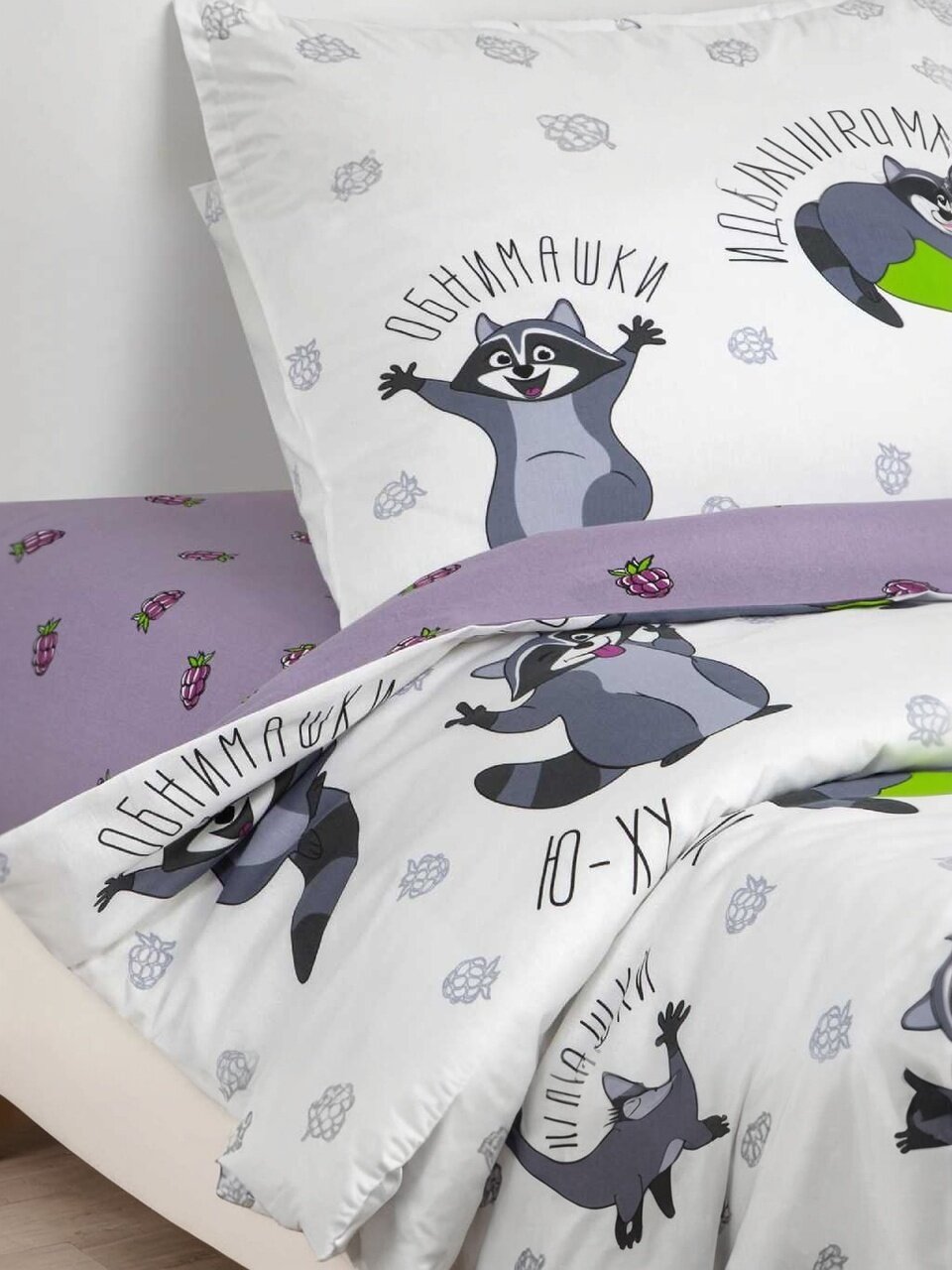 - Детский комплект с оригинальным рисунком енотов — создаёт уют и интерес для ребёнка