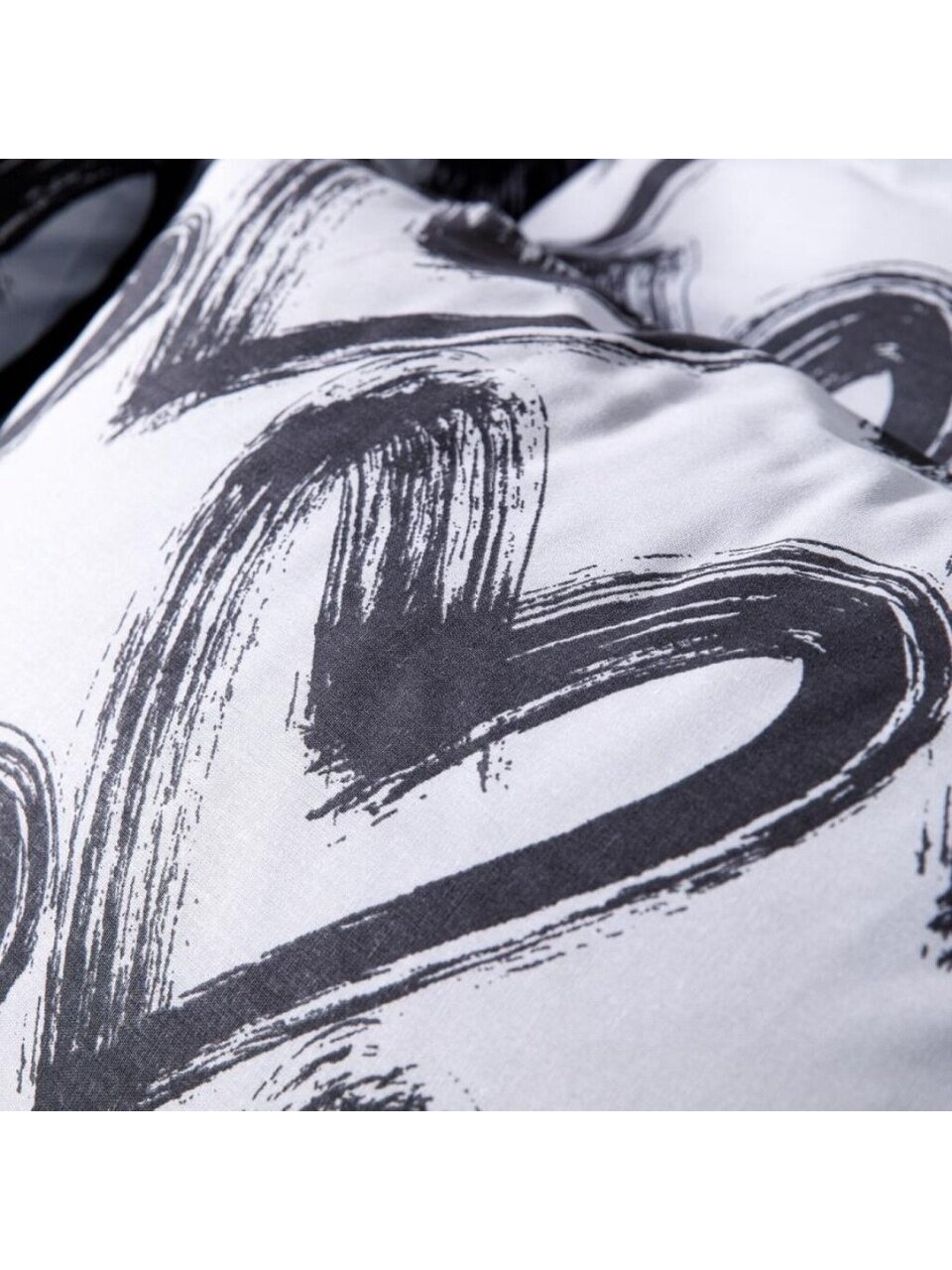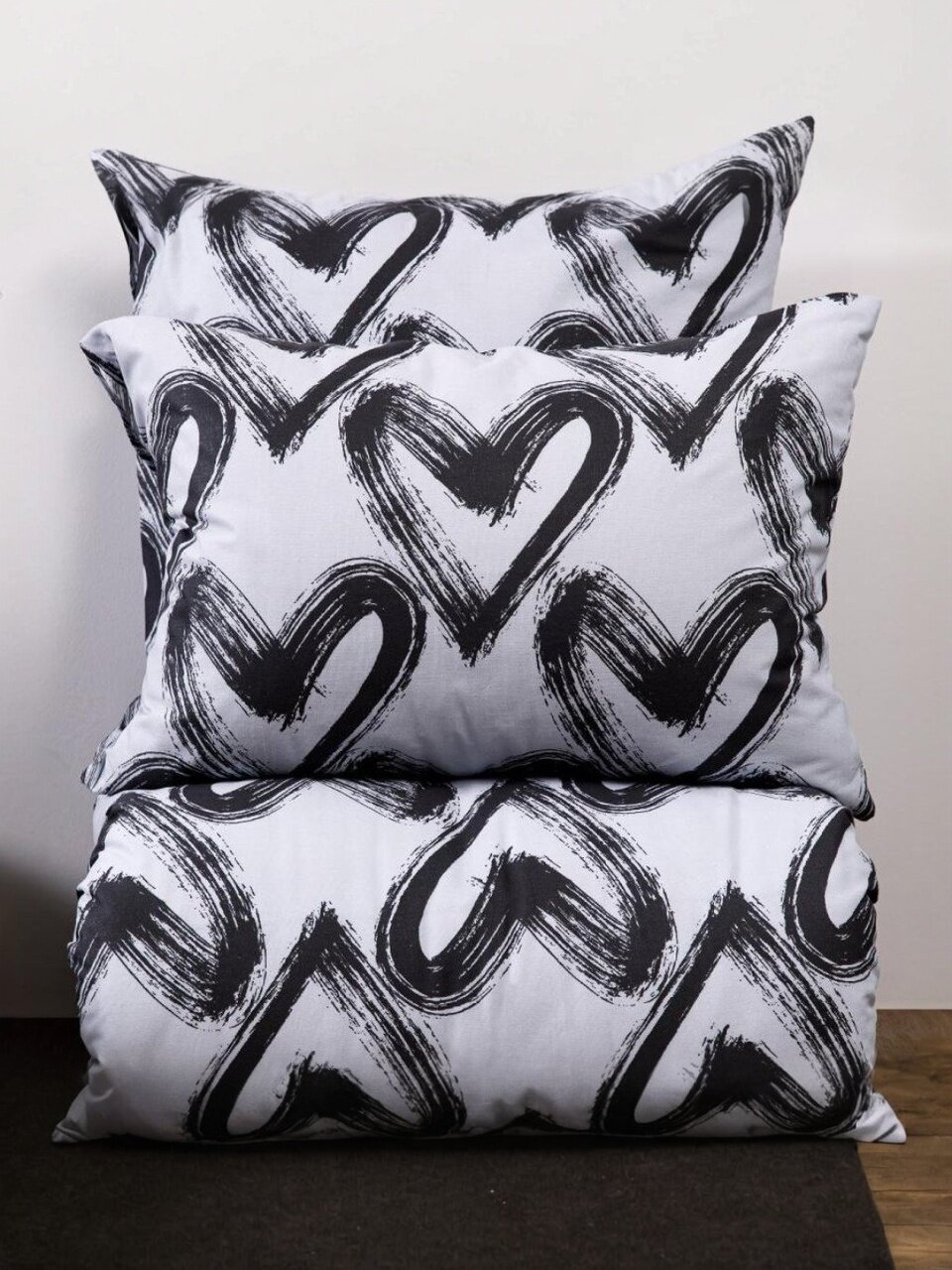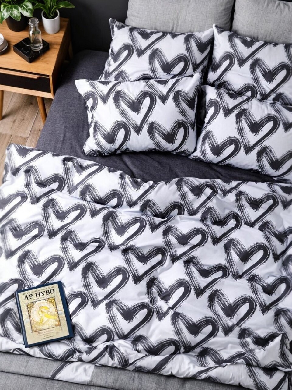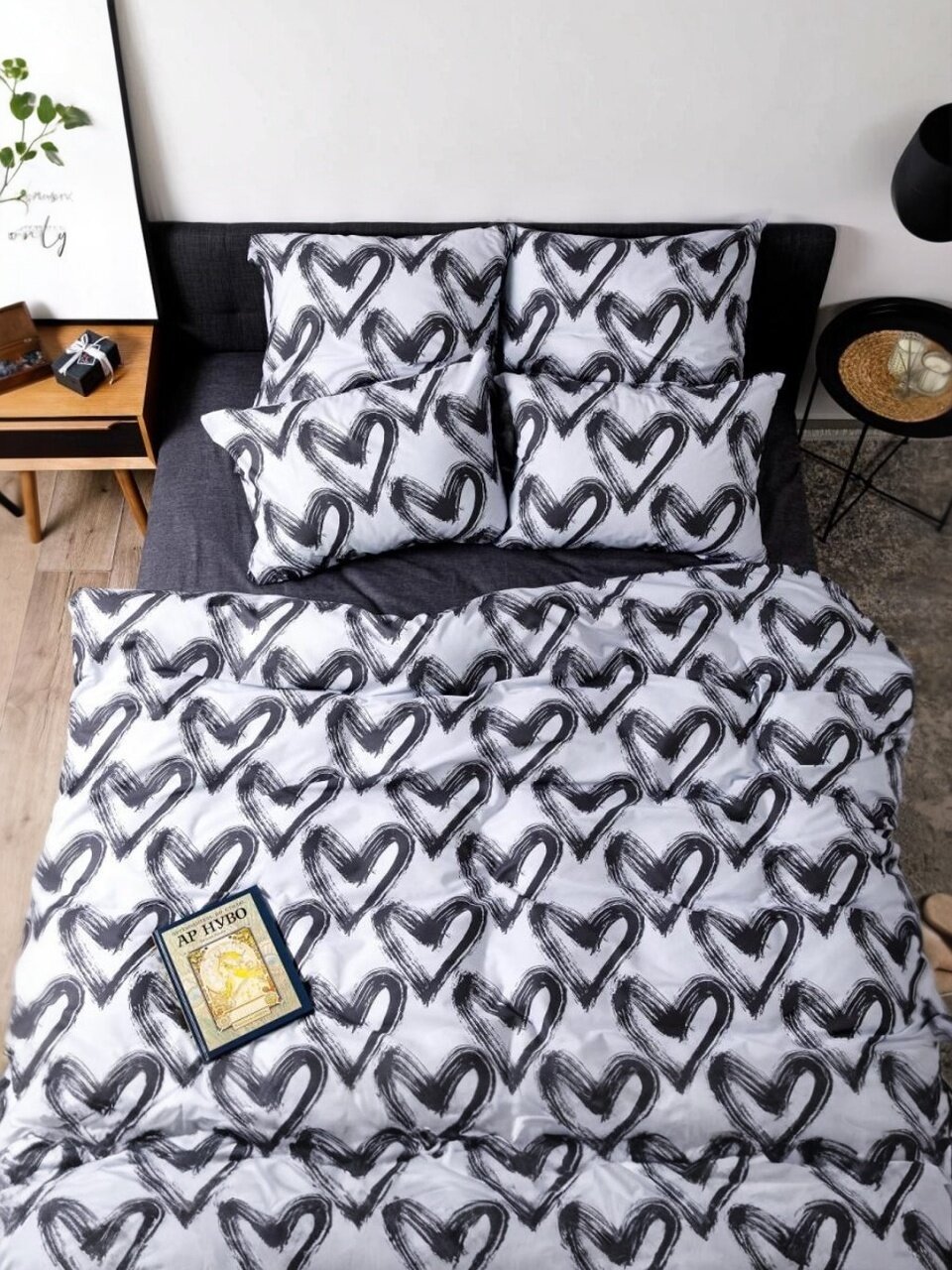 Постельное белье евро «Dark love» из бязи: 100% хлопок, 4 предмета, стильный серый дизайн с сердечками — уют для дома и подарок в подарочной упаковке.