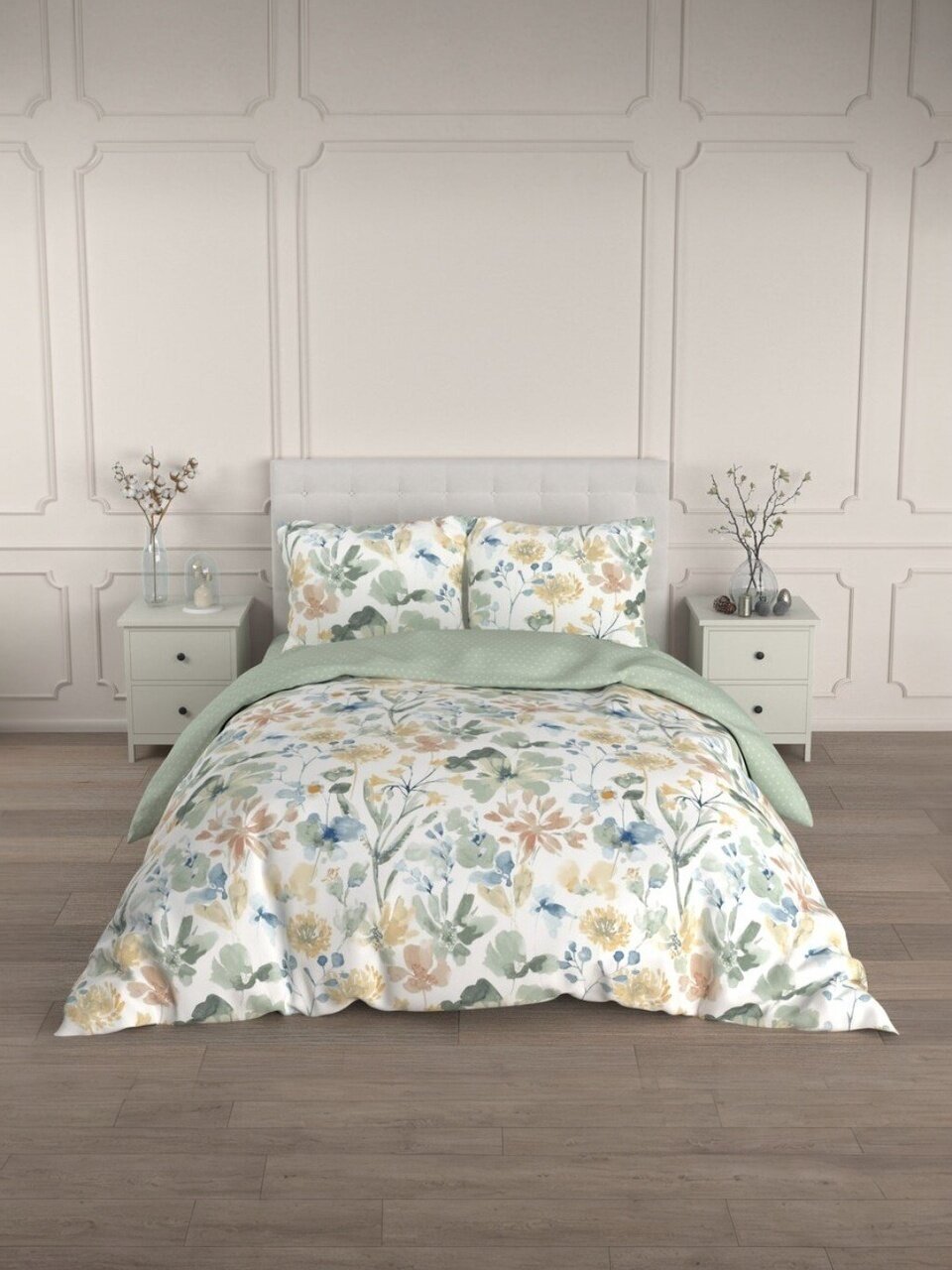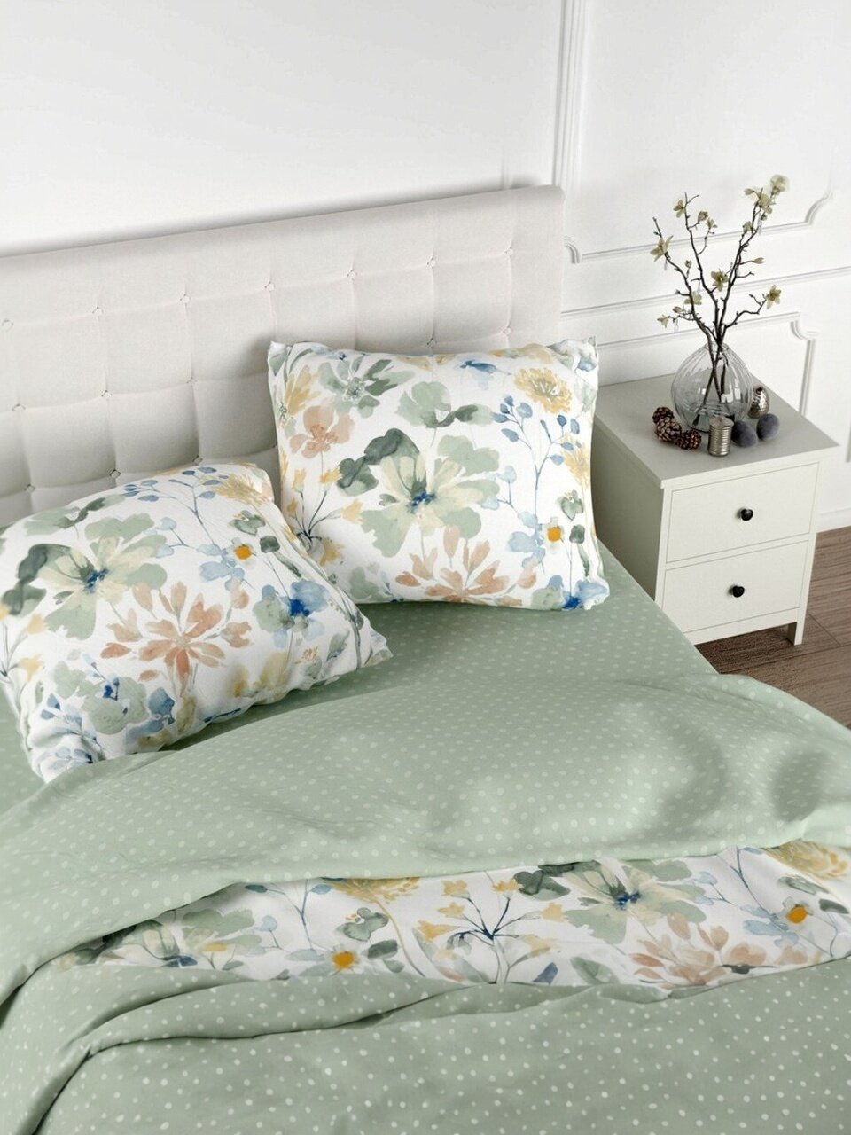 В комплекте 4 предмета: простыня, пододеяльник и 2 наволочки 70х70 см. Все элементы выполнены в едином дизайне с цветочным рисунком.
