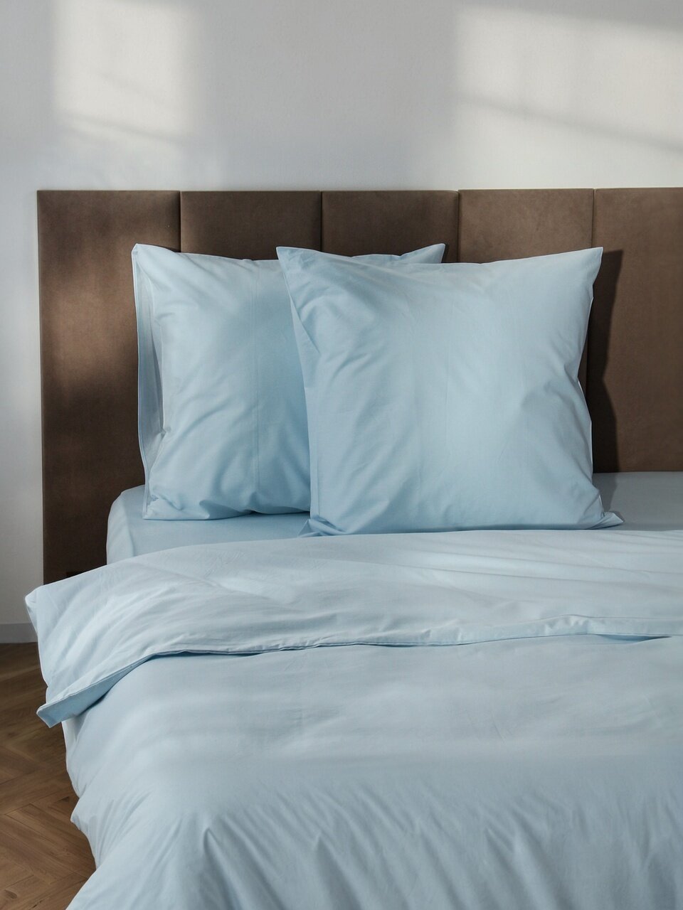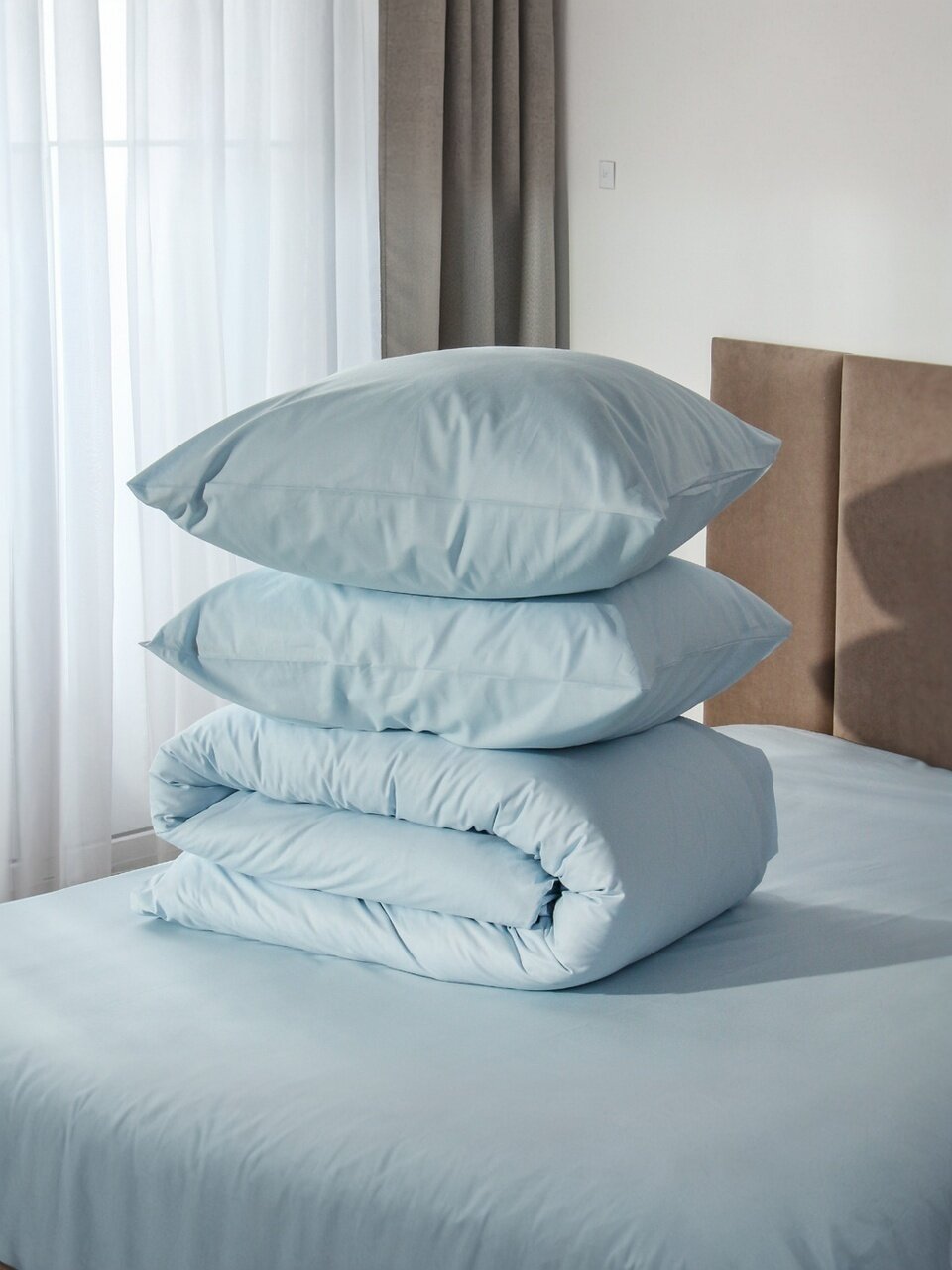Поплин — натуральный хлопок, прочный и простой в уходе: легко стирается, быстро сохнет, не требует глажки. Голубой цвет и подарочная упаковка делают комплект универсальным для любого случая.