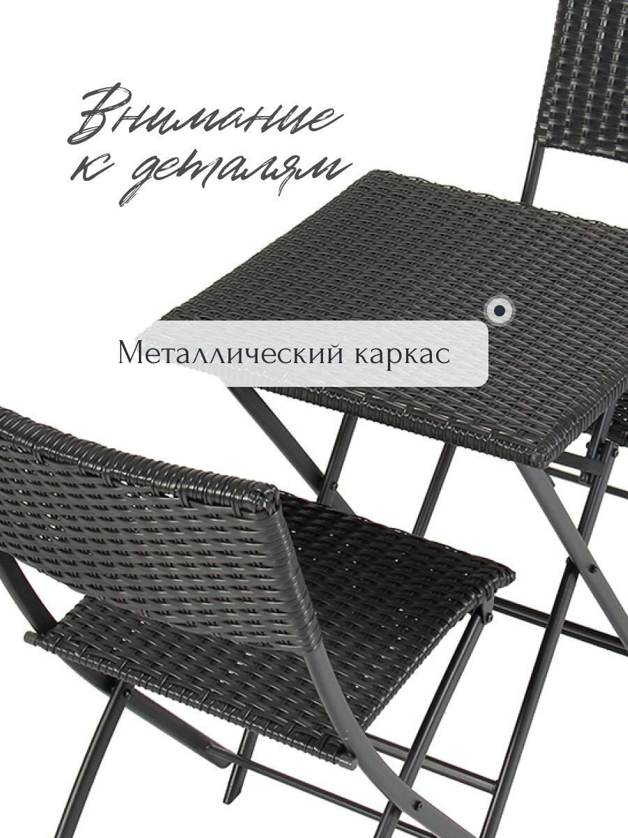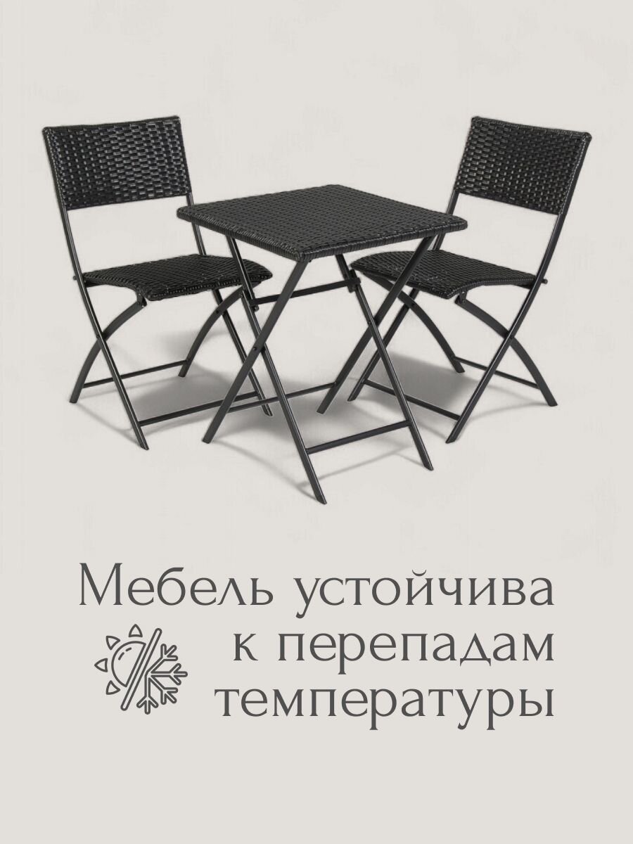 Мебель отличается прочным стальным каркасом и жестким сиденьем, что обеспечивает надежность и долговечность в ежедневном использовании. Максимальная нагрузка как на стол, так и на стулья составляет 120 кг. Складная конструкция упрощает хранение и транспортировку, позволяя быстро освободить пространство или взять комплект с собой на пикник или кемпинг. Благодаря универсальности, мебель подходит для различных целей: от семейных обедов на свежем воздухе до организации комфортной зоны для отдыха в кафе или на даче.
