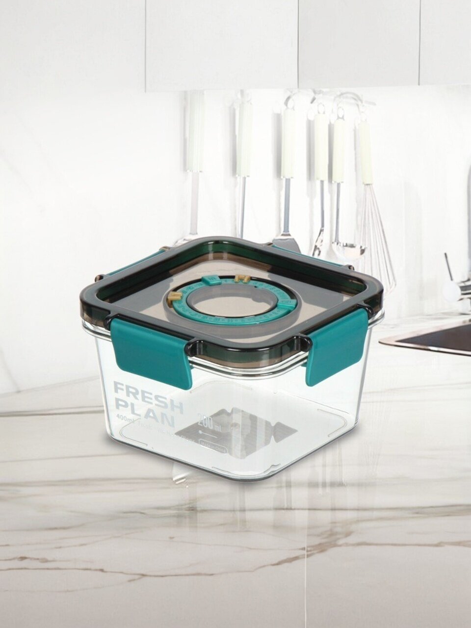 Объем 0.4 л, размеры 11.8×11.8×6.5 см, материал — пищевой пластик, квадратная форма, прозрачный цвет, герметичная вакуумная крышка с клапаном и защёлкой.