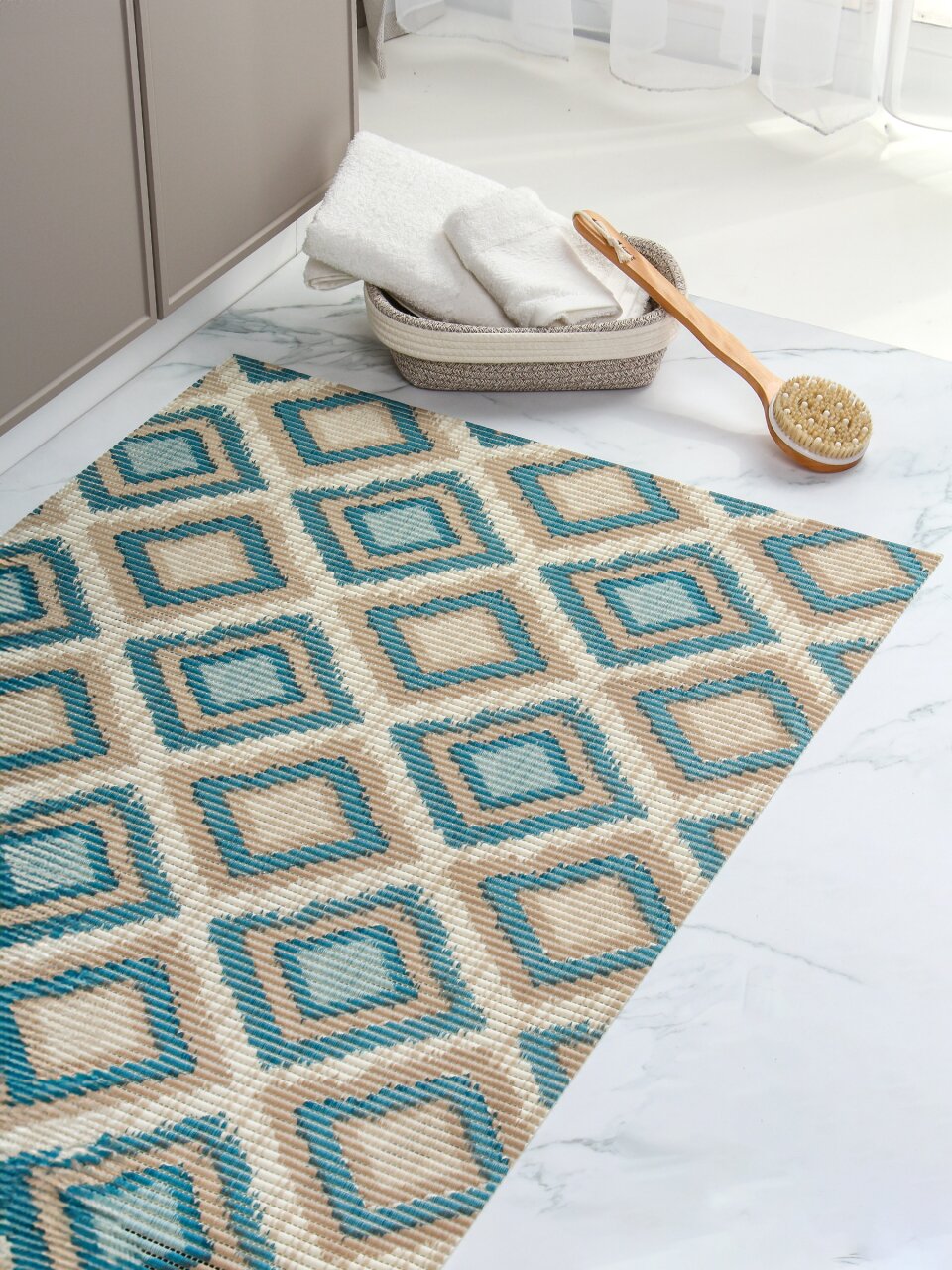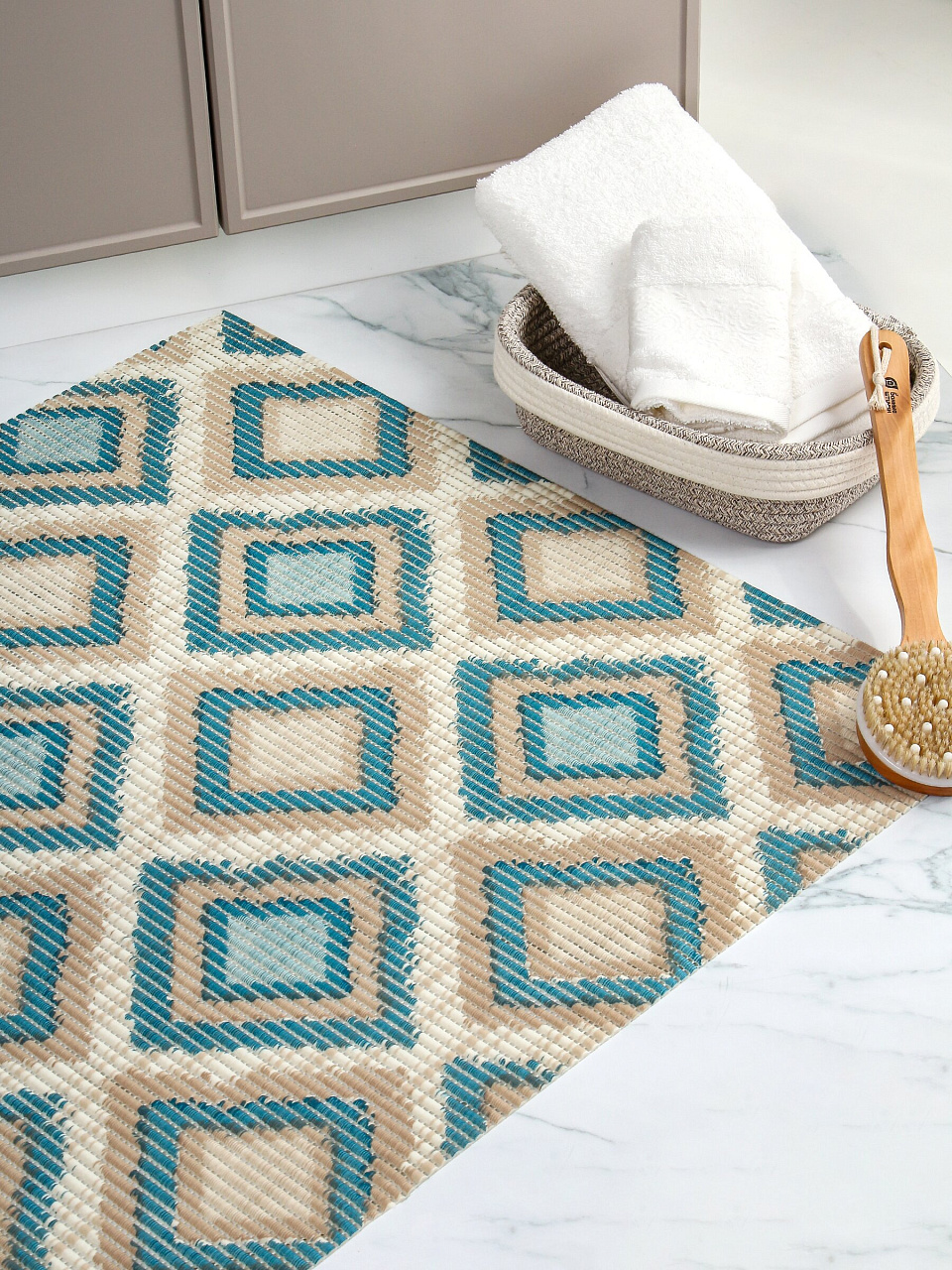 В отличие от стандартных ковриков, этот не имеет присосок, что облегчает его перемещение и чистку. Покрытие с ромбовидным рисунком не только стильно смотрится, но и усиливает антискользящий эффект. Если вы спрашиваете, подходит ли коврик для ванной с подогревом пола — вспененный ПВХ хорошо переносит температуру и не деформируется. Для тех, кто выбирает между ковриками с массажным эффектом и простыми — этот вариант обеспечивает базовую защиту и мягкость без дополнительных рельефов.