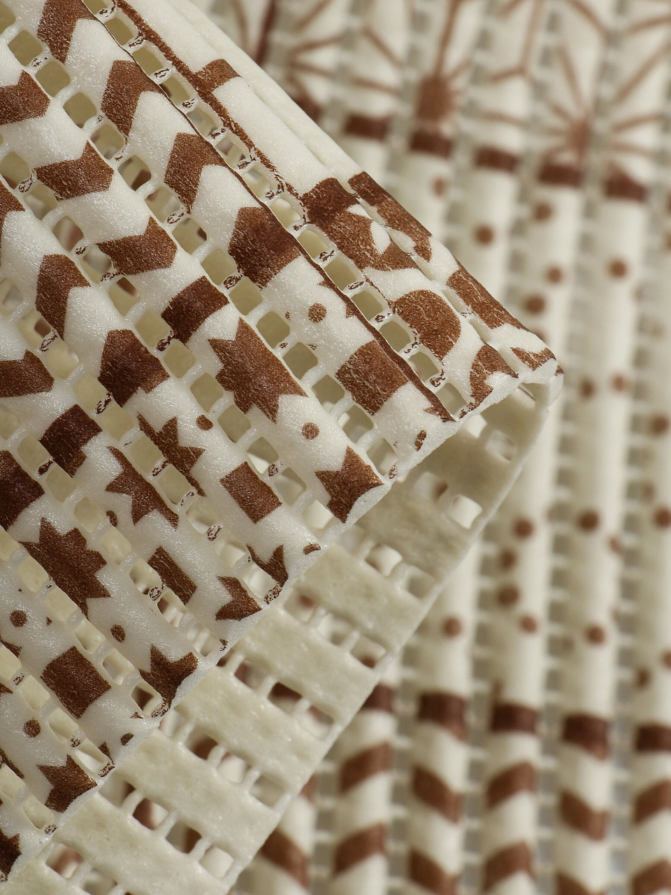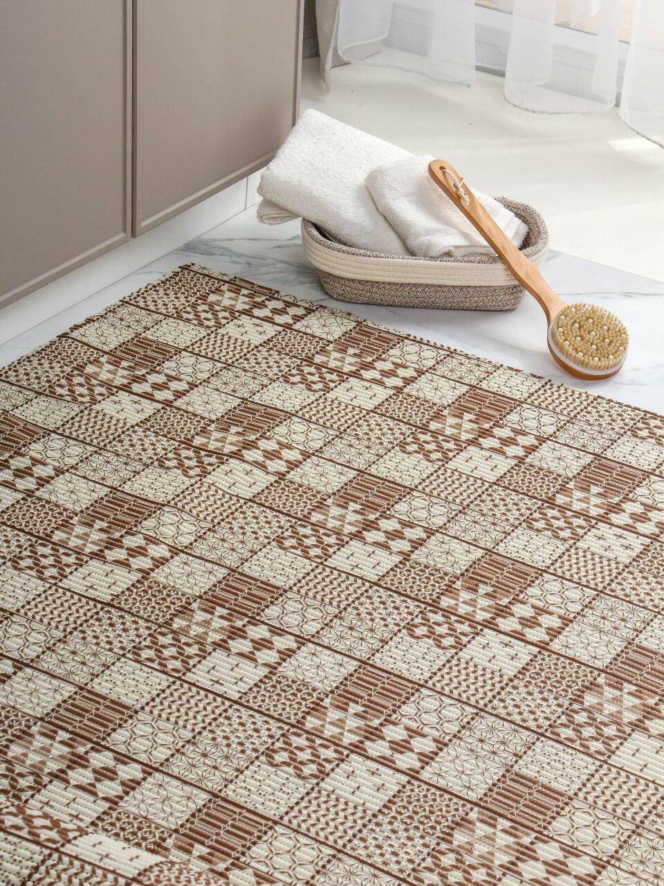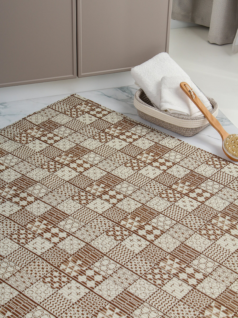 Коврик для ванной Вилина 218PT-brown 1,3х15 м: безопасное покрытие из вспененного ПВХ для защиты от скольжения, долговечность и комфорт в ванной комнате.