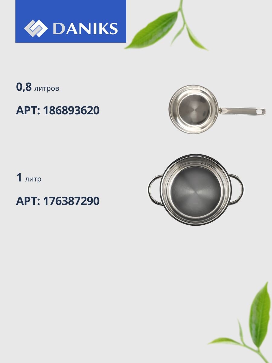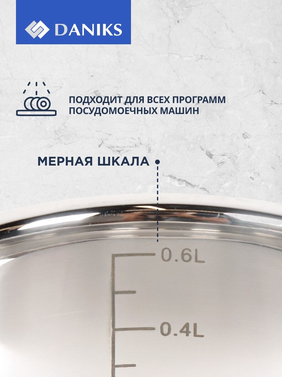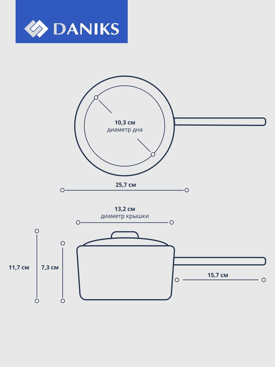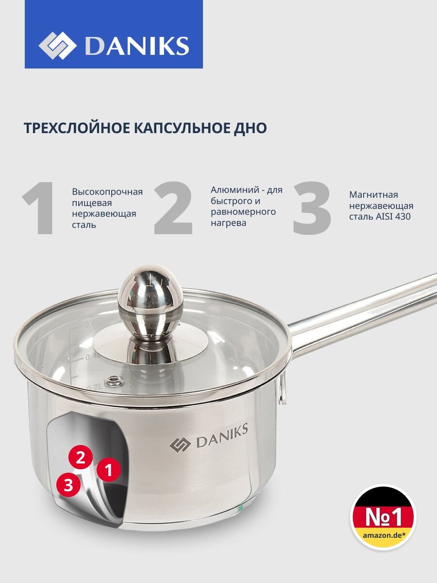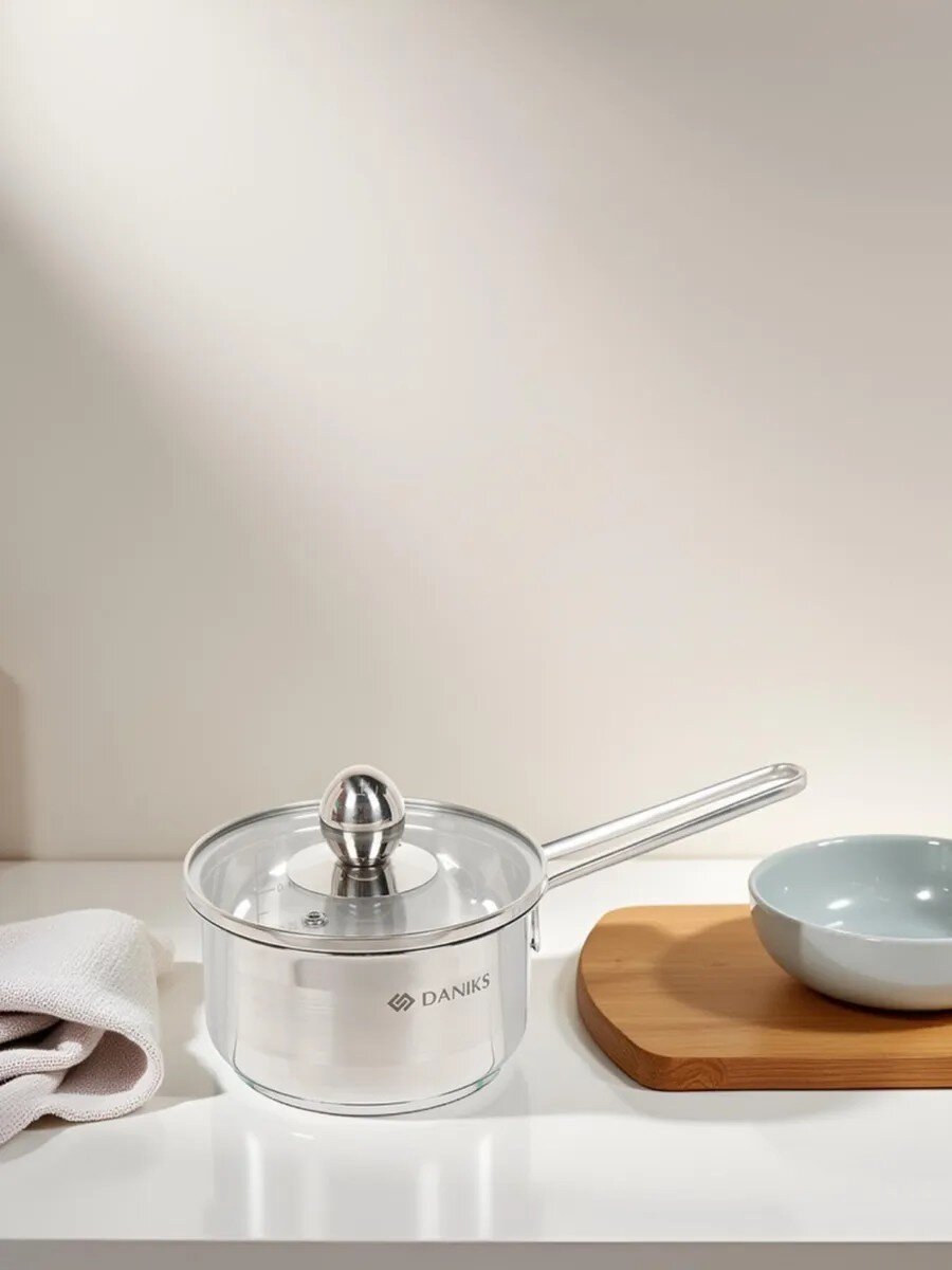 Ковшик Daniks выполнен из высококачественной нержавеющей стали. Крышка из прозрачного стекла позволяют контролировать процесс приготовления пищи. Металлическая ручка удобна, прочна и не нагревается при использовании посуды.