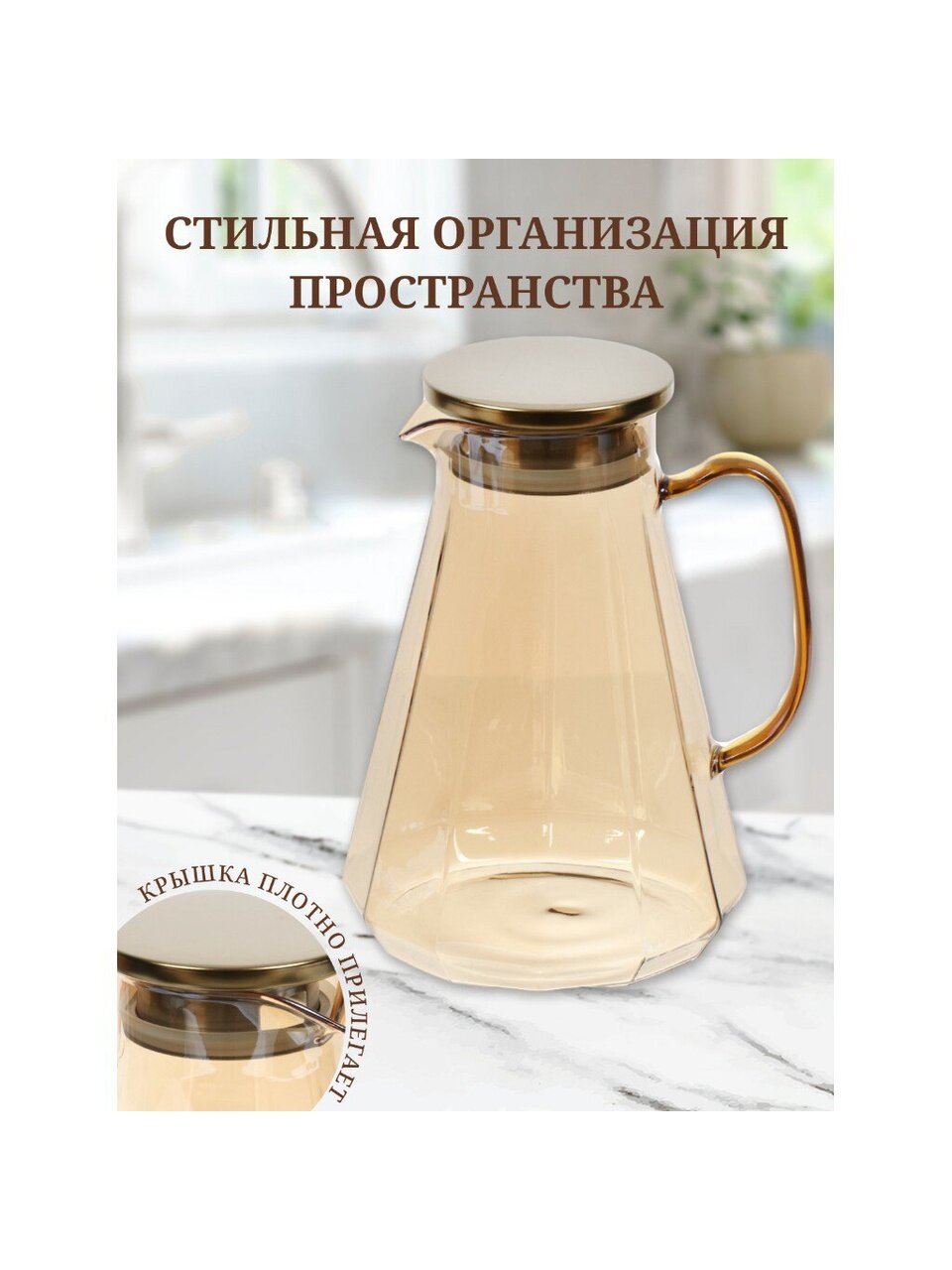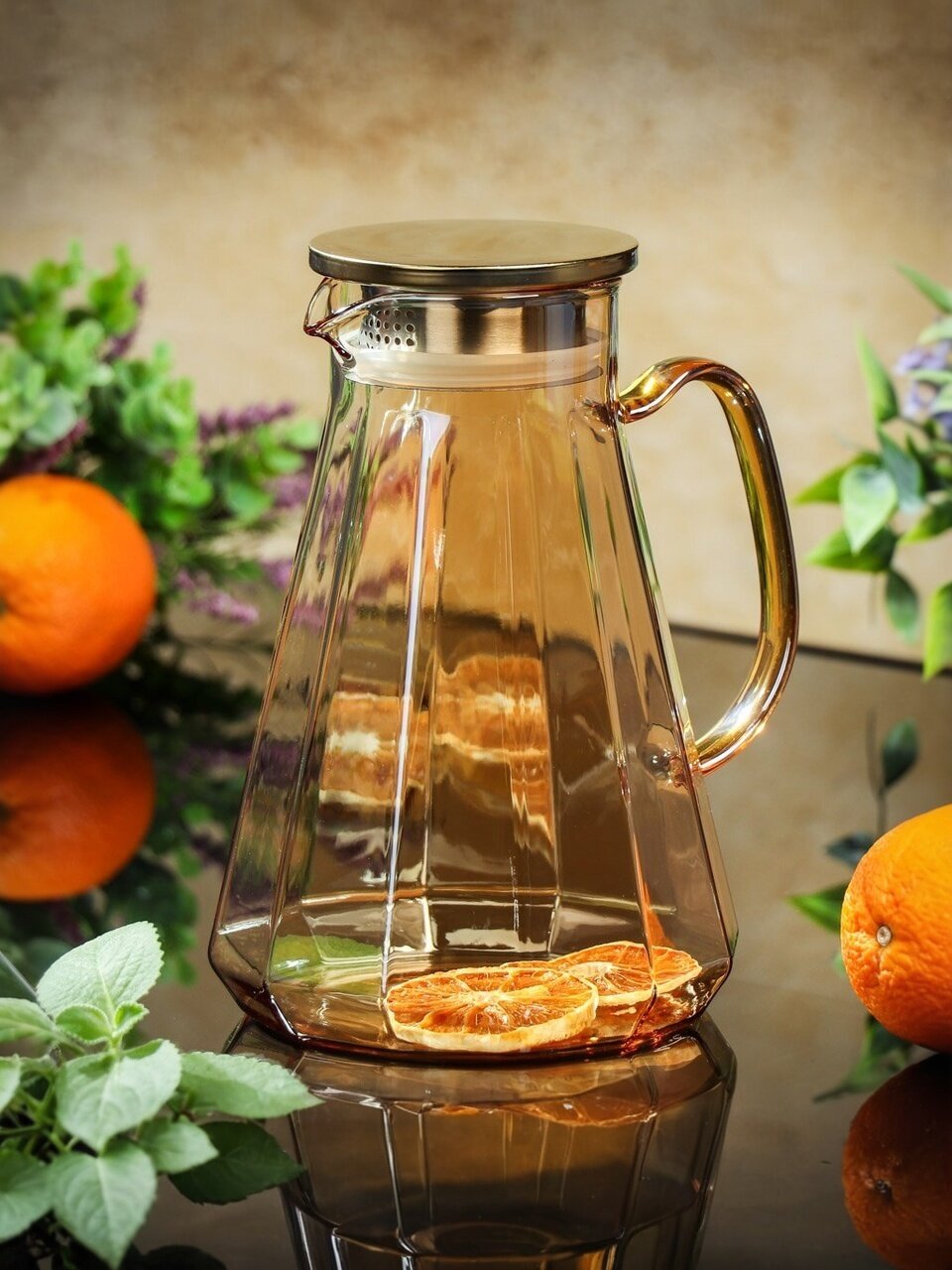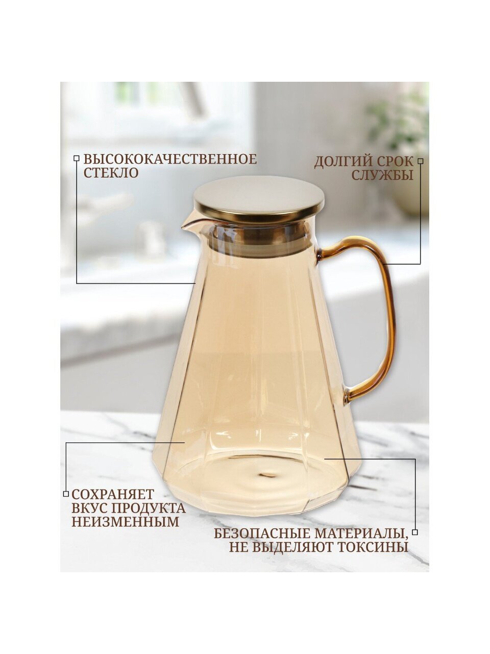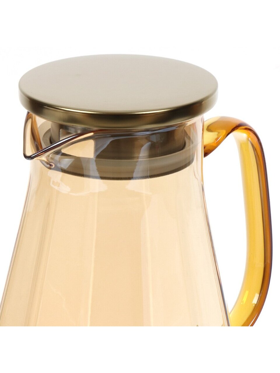 Стеклянный кувшин - полезный кухонный атрибут, который можно использовать в качестве ёмкости для Ваших любимых напитков. Данная модель кувшина изготовлена из стекла и выполнена в нежном золотисто-медовом цвете. Кувшин закрывается с помощью крышки, которая сохранит аромат и вкус Вашего напитка насыщенным. Станет прекрасным дополнением на Вашем повседневном, или праздничном столе, а также хорошим вариантом для подарка. Выполнен из термостойкого стекла и подходят для горячих напитков (чая/кофе).