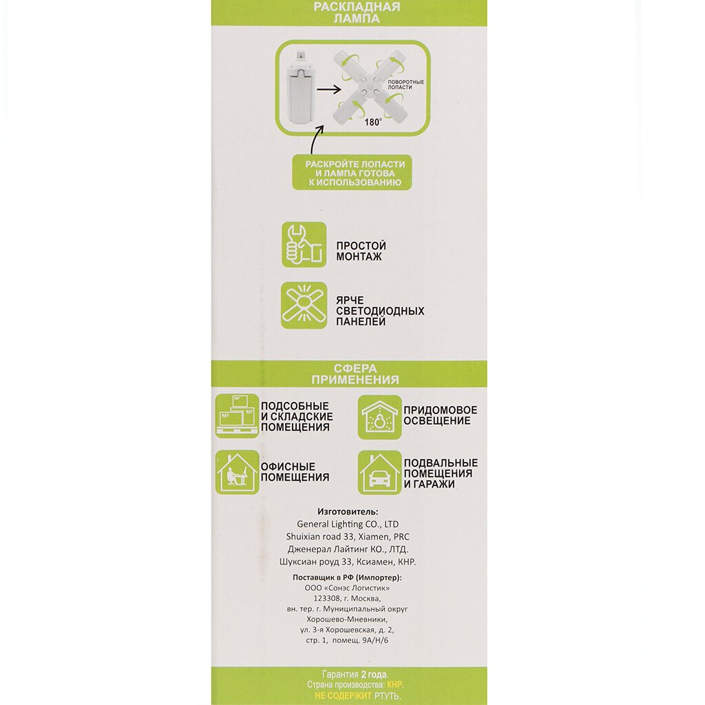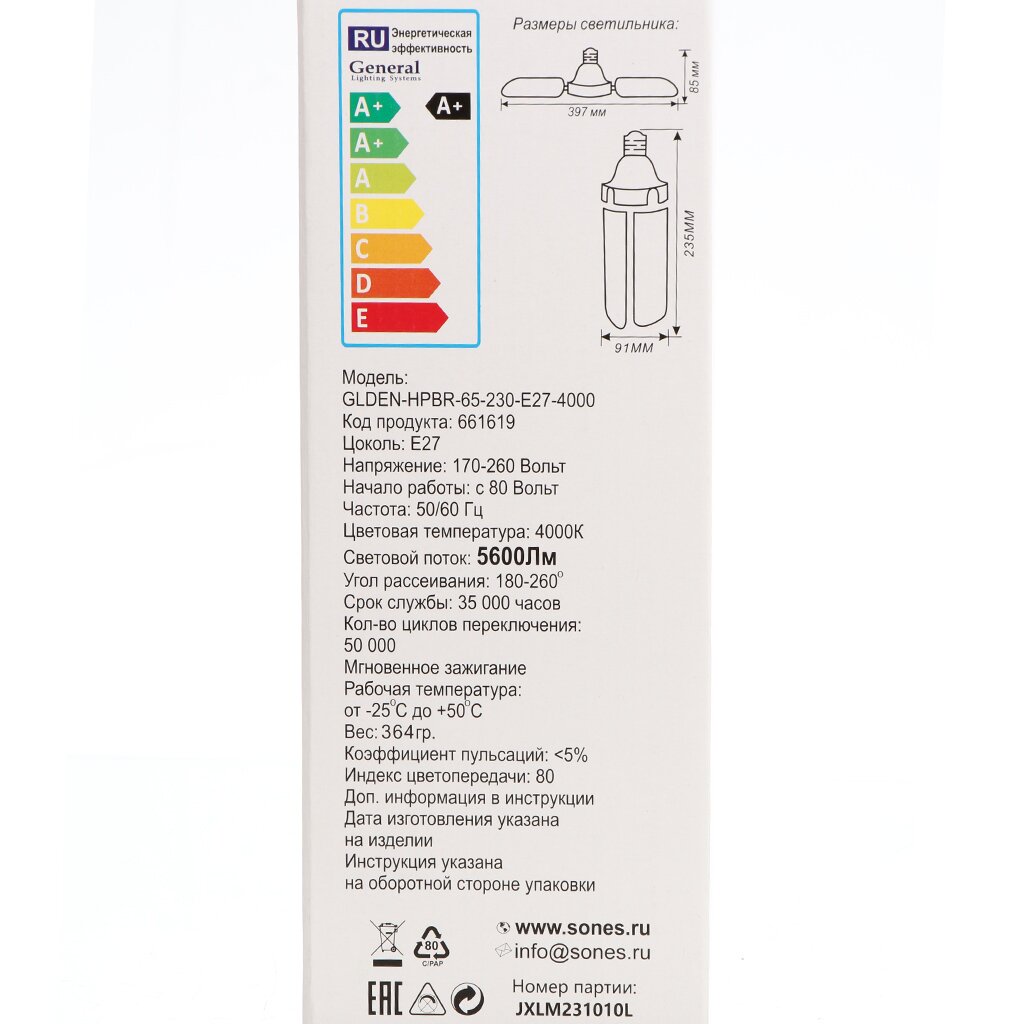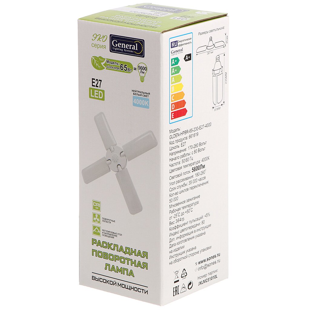 Обратите внимание на мощность (65 Вт), световой поток (5600 лм) и тип цоколя (E27). Эта лампа подходит для больших и высоких помещений благодаря раскладной конструкции и холодному белому свету.