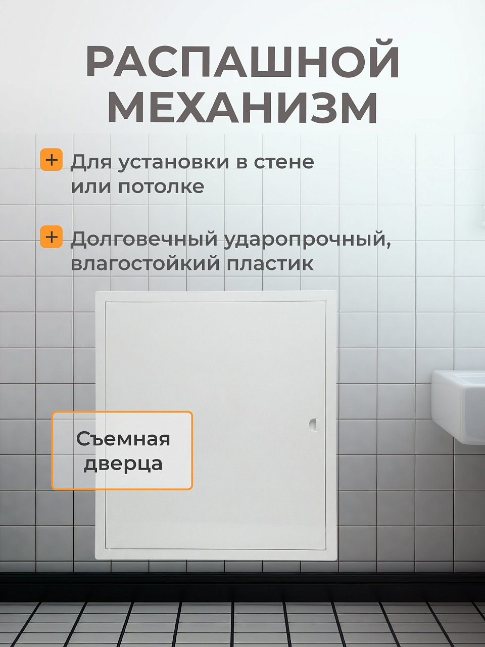 - Люк-дверца ревизионная изготовлен из высокопрочного и износостойкого материала - ABS-пластика. Этот материал обеспечивает длительный срок службы изделия и устойчивость к внешним воздействиям, таким как влага и коррозия.