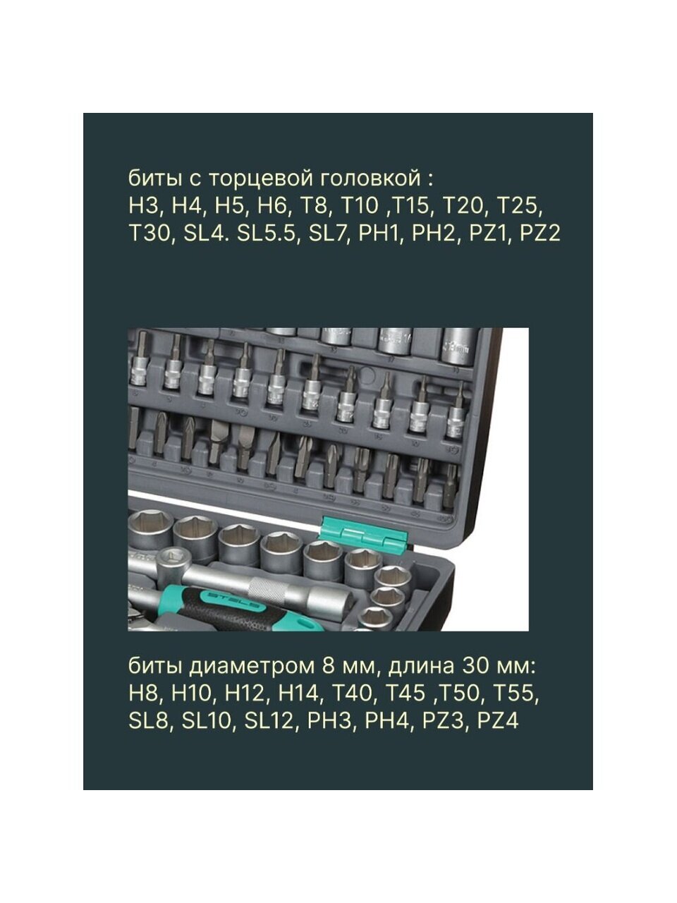 - Биты с торцевыми головками PH1, PH2, SL4, SL5.5, SL7, PZ1, PZ2, H3, H4, H5, H6, T8, T10, T15, T20, T25, T30;