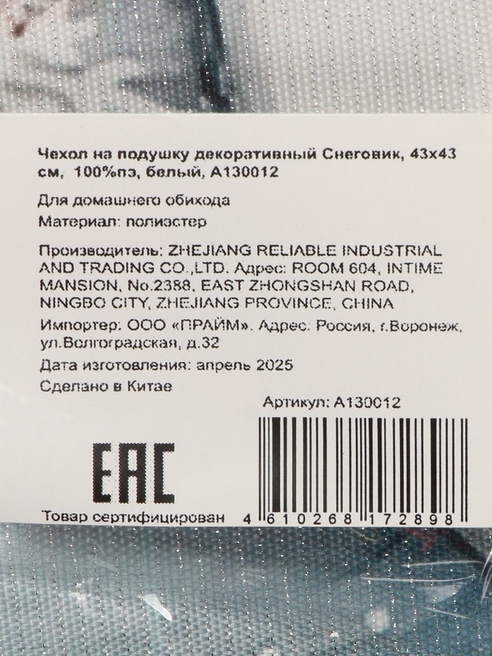 Чехол на подушку декоративный Снеговик, 43х43 см, 100%пэ, белый, A130012