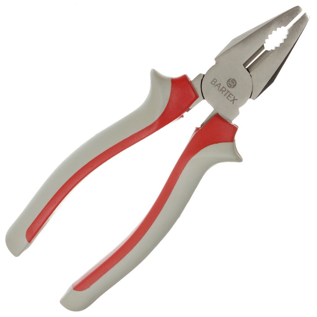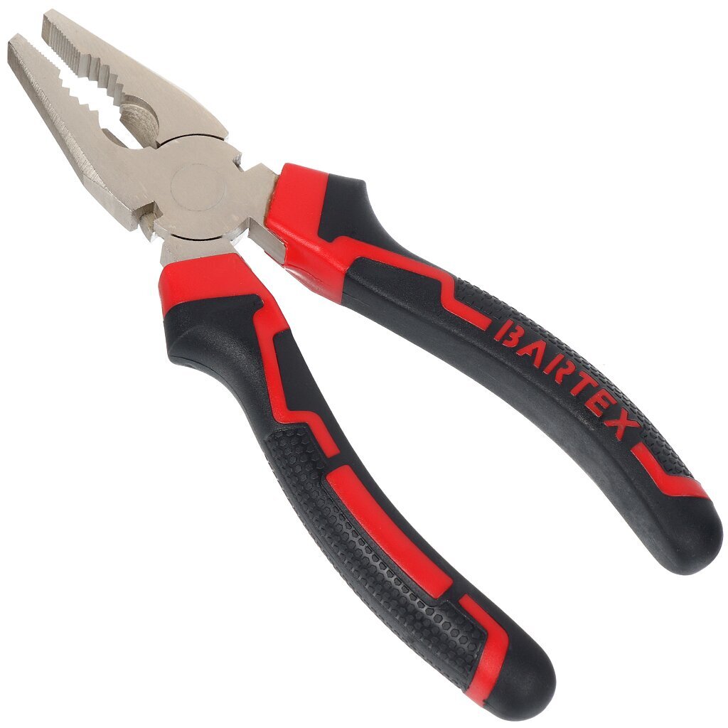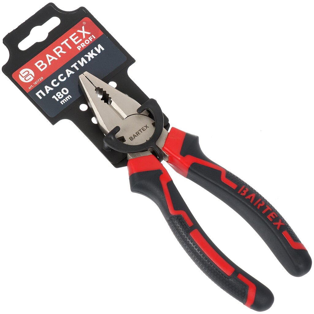 Пассатижи Bartex Профи предназначены для захвата деталей различных форм. Инструмент изготовлен из углеродистой стали, рукоятки выполнены из ударопрочного пластика.