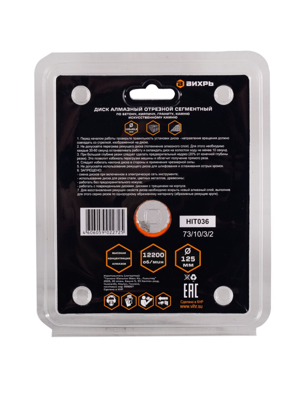 Диск алмазный отрезной сегментный Вихрь 73/10/3/2 предназначен для угловых шлифовальных машин и резчиков. Применяется для сухого реза по бетону, кирпичу, граниту, камню, искусственному камню.
