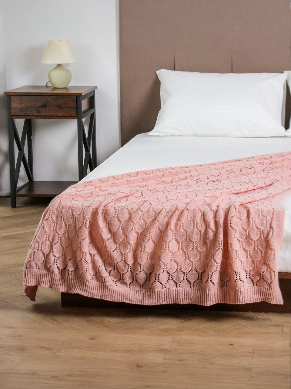 - Вязаный плед из 100% полиэстера — легкий, гипоаллергенный, быстро сохнет.