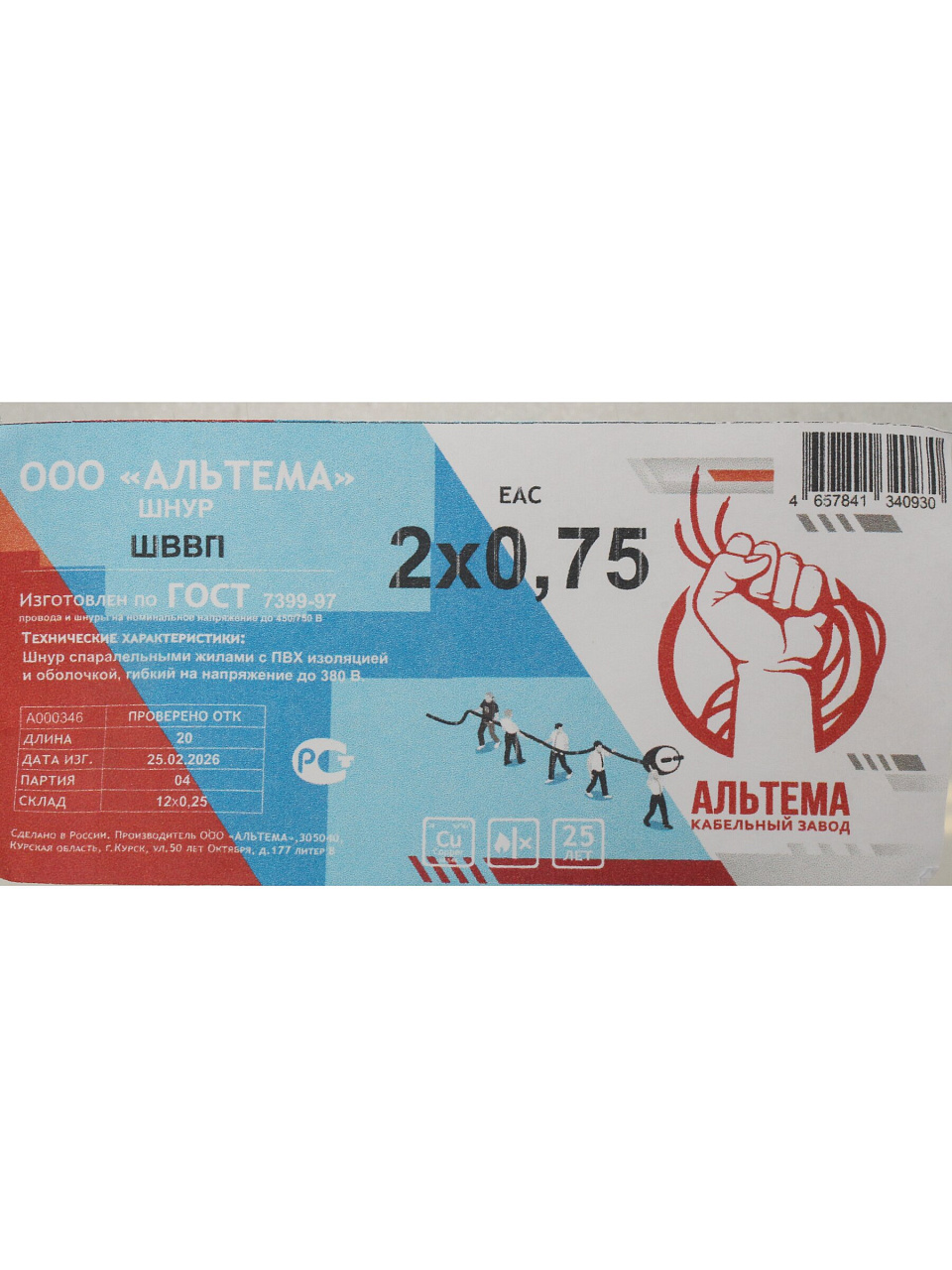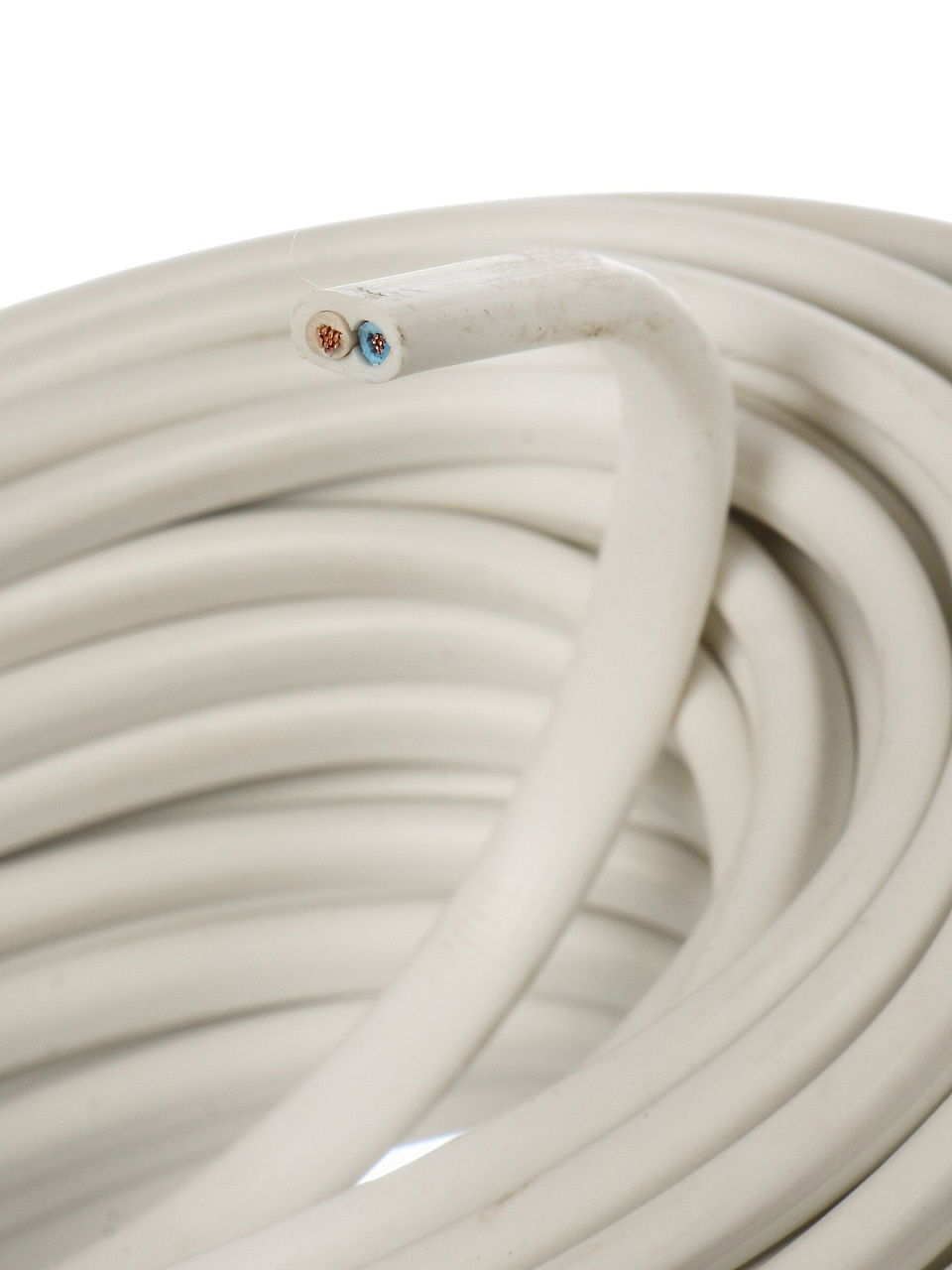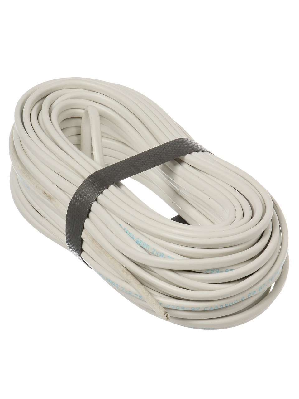 Провод состоит из 2 медных жил сечением 0.75 мм², длина — 20 метров, белая изоляция, соответствует ГОСТ, предназначен для бытового использования.