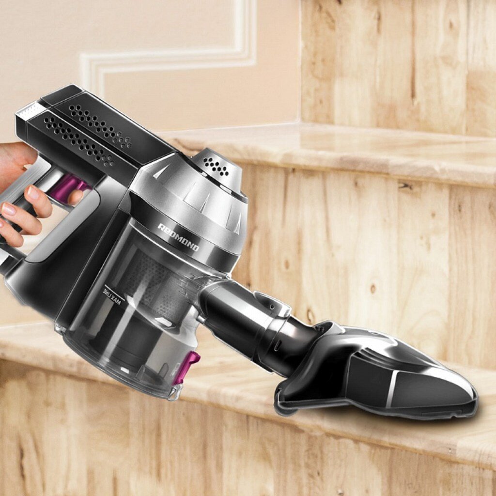 Беспроводной вертикальный пылесос 2 в 1 REDMOND RV-UR340 работает от аккумулятора и не имеет провода, поэтому с его помощью удобно чистить мягкую мебель, холлы, лестницы или салон автомобиля.
