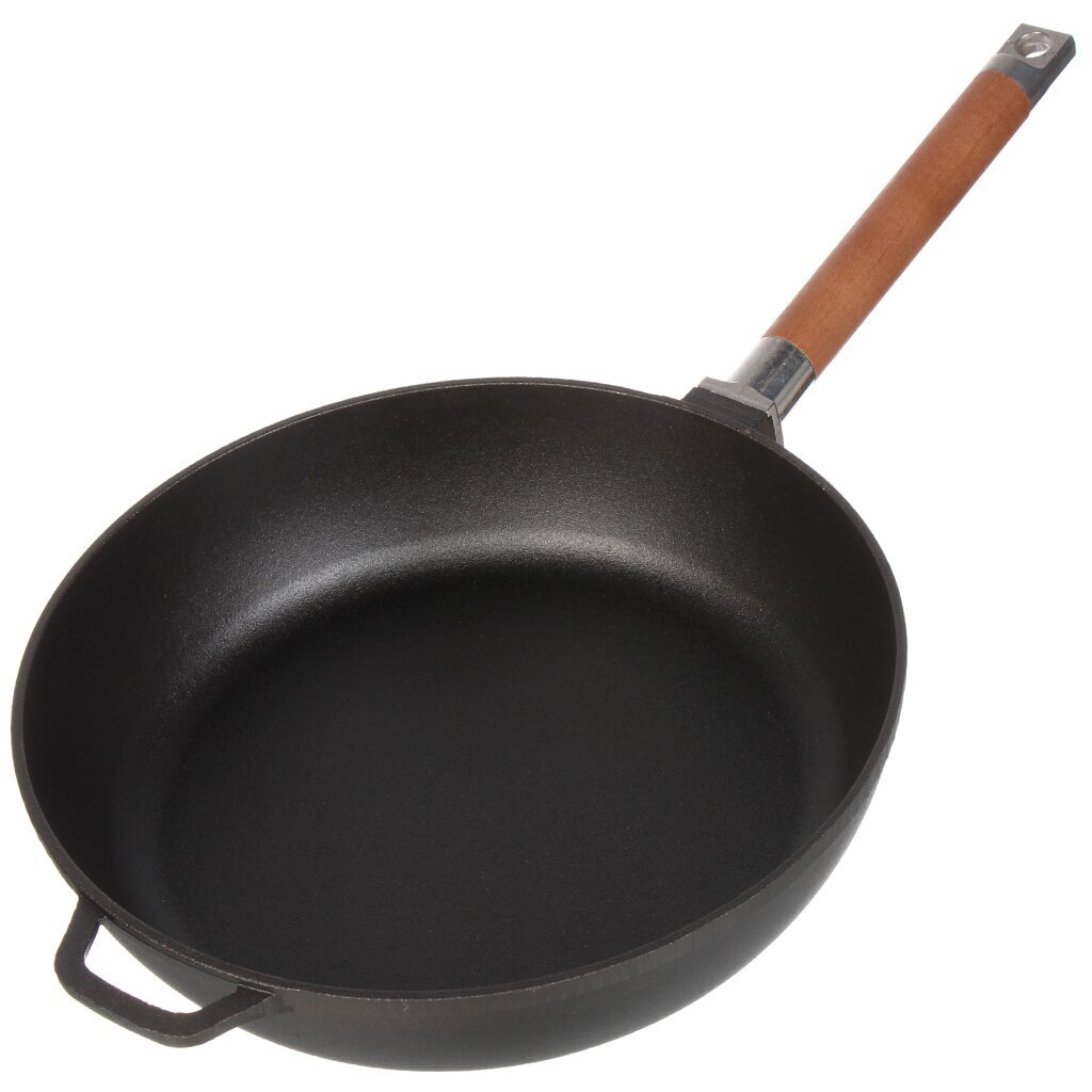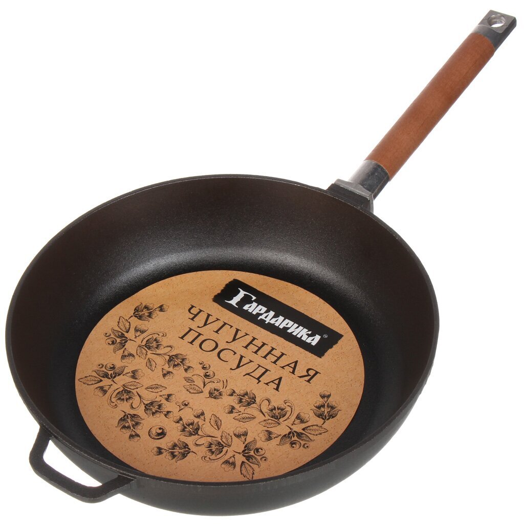 Чугунная сковорода Гардарика 28 см с высокой стенкой и съёмной деревянной ручкой: жарьте мясо, рыбу или омлет на любой плите без вреда для вкуса и здоровья.