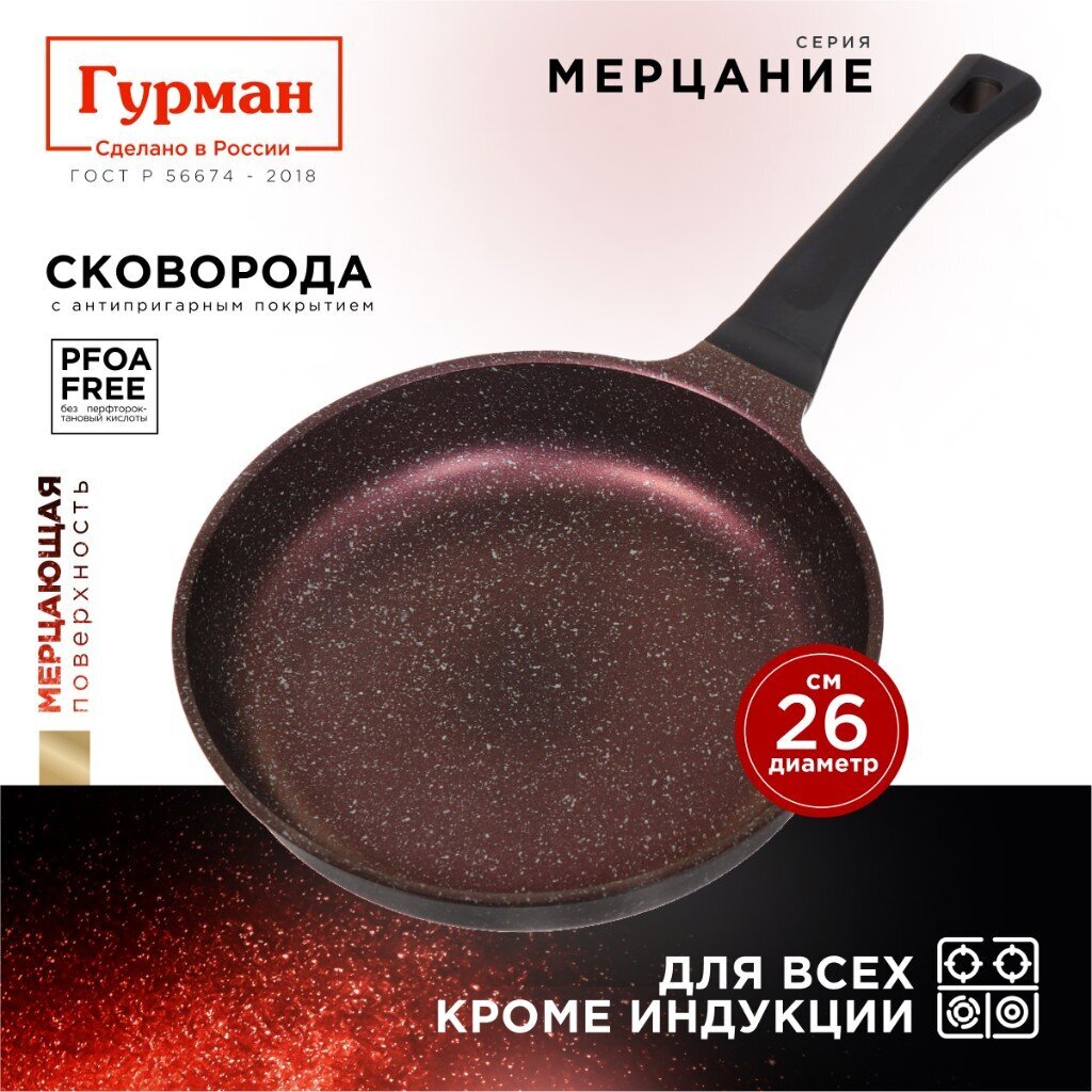 Сковорода «Гурман Мерцание» диаметром 26 см — выбор тех, кто ищет надежную посуду для ежедневного использования. Литой алюминий обеспечивает прочность и быстрый нагрев, а мраморное покрытие защищает от пригорания и облегчает уход. Если вы ищете, какую сковороду выбрать для газовой или электрической плиты, обратите внимание на эту модель: она совместима с большинством типов плит, кроме индукционных. Отсутствие съемной ручки и крышки — плюс для простоты эксплуатации и хранения.