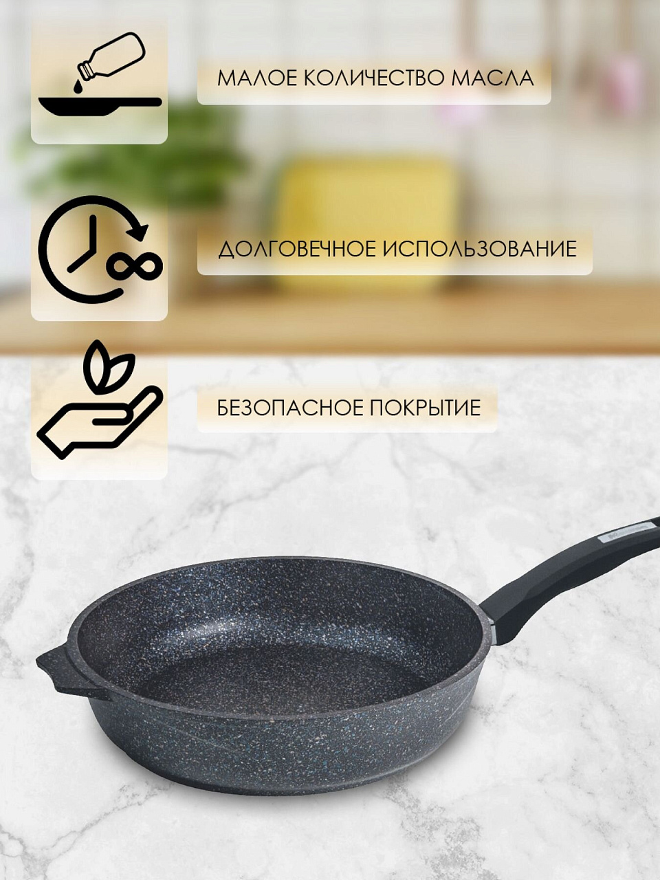 Сковорода Мечта Гранит star диаметром 24 см изготовлена из литого алюминия — это современный выбор для тех, кто ищет антипригарную сковороду для дома или дачи. Гранитное покрытие обеспечивает максимальную защиту от пригорания и позволяет готовить с минимальным количеством масла. Благодаря толщине дна 6 мм и стенок 4 мм, сковорода быстро и равномерно прогревается, что особенно важно для приготовления сочного мяса, рыбы или деликатных омлетов.