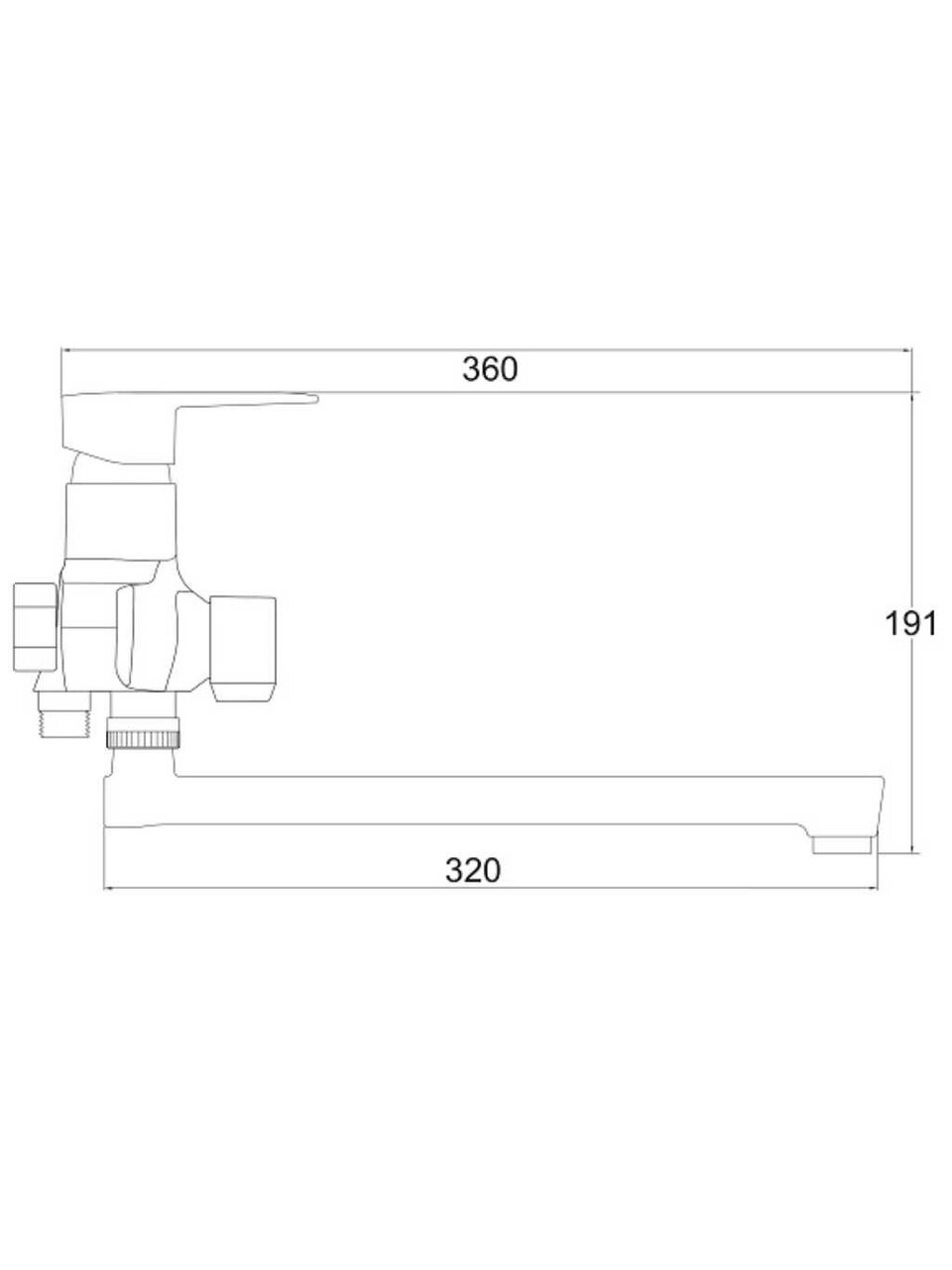 Длина излива — 32 см (длинный поворотный), межосевое расстояние — 150 мм, монтаж вертикальный на стену через 1 отверстие, стандарт подводки — 1/2".