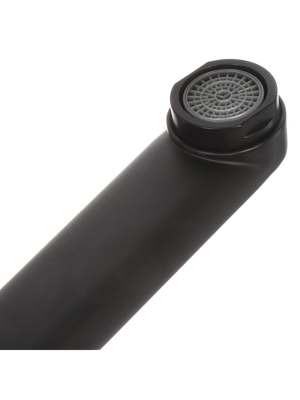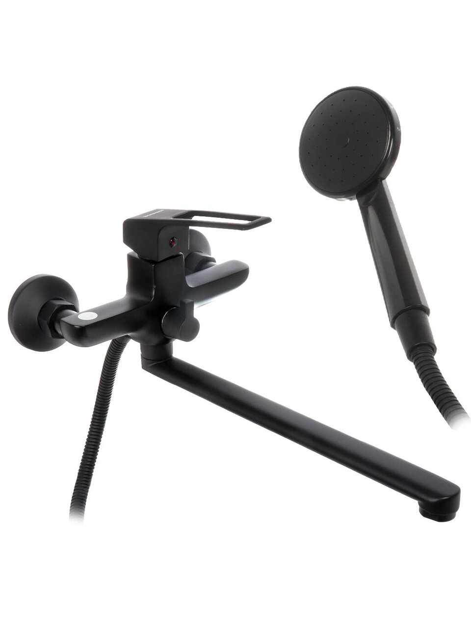- Современный черный матовый смеситель с длинным изливом 30 см — удобно для наполнения ванны и мытья душем