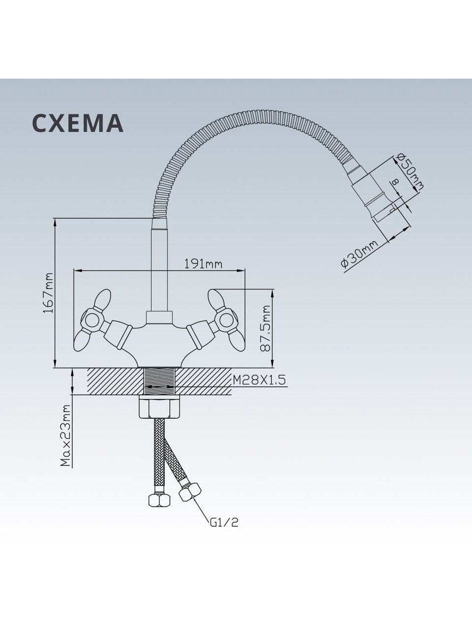 Длина гибкого излива — 35 см, материал корпуса — цинковый сплав с глянцевым хромированием, что обеспечивает прочность и современный вид.