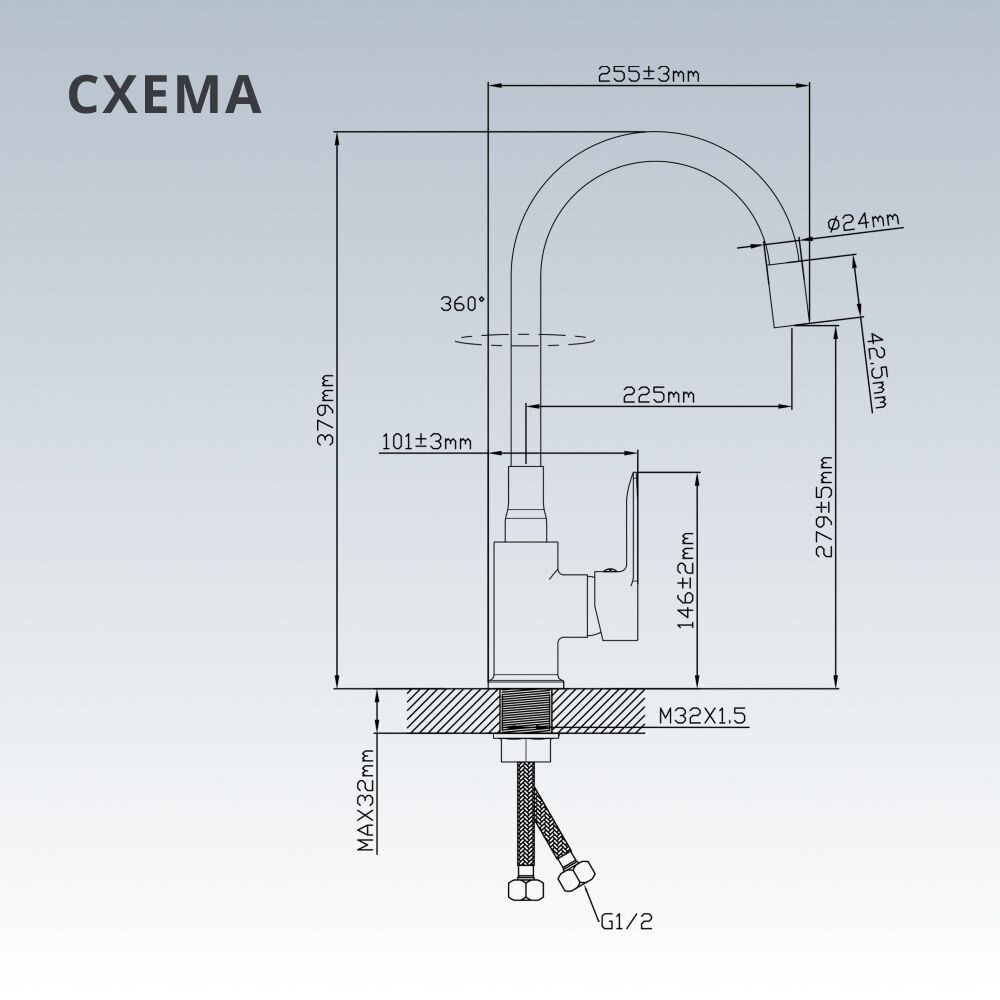 Для установки требуется 1 отверстие диаметром 45 мм, стандартная подводка 1/2", крепление — гайка, монтаж горизонтальный.