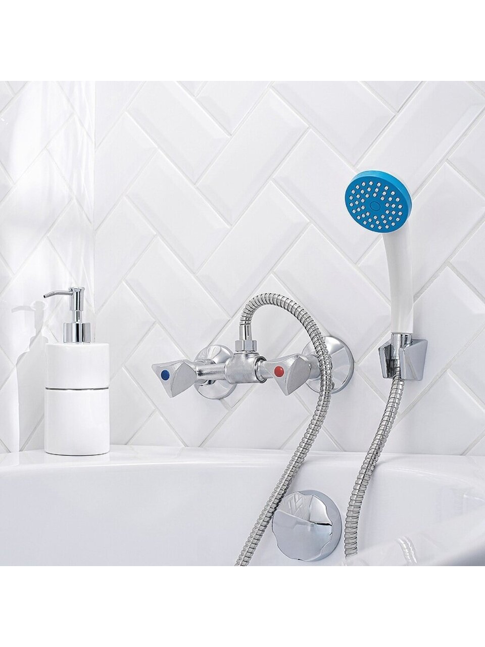 Смеситель оснащён двухвентильным поворотным управлением и рассчитан на стандартное межосевое расстояние 150 мм, что подходит для большинства душевых систем с настенным креплением.