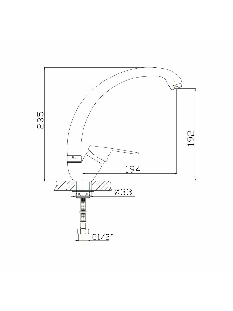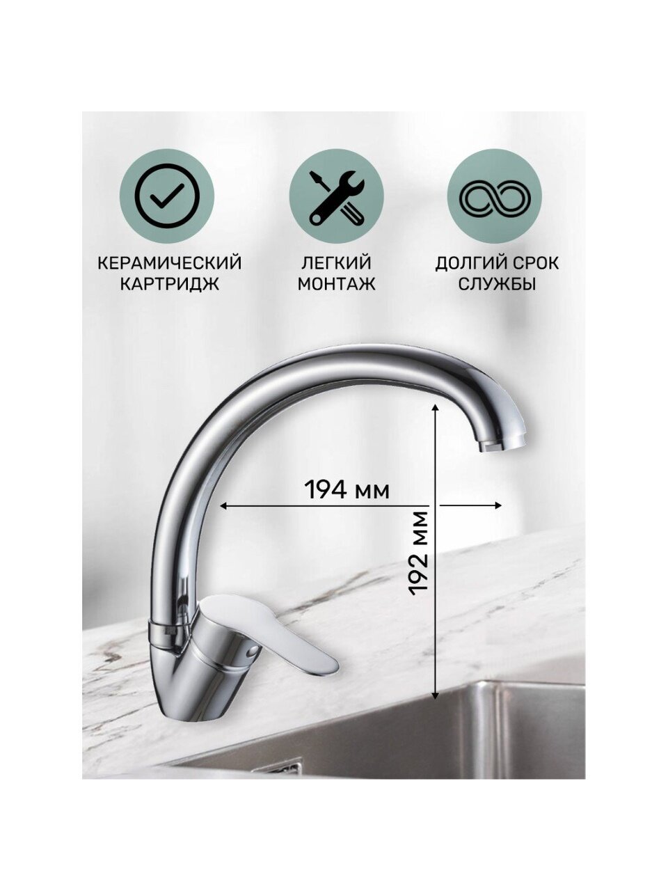 - Высокий поворотный излив 19,2 см — удобно мыть крупную посуду и наполнять большие ёмкости