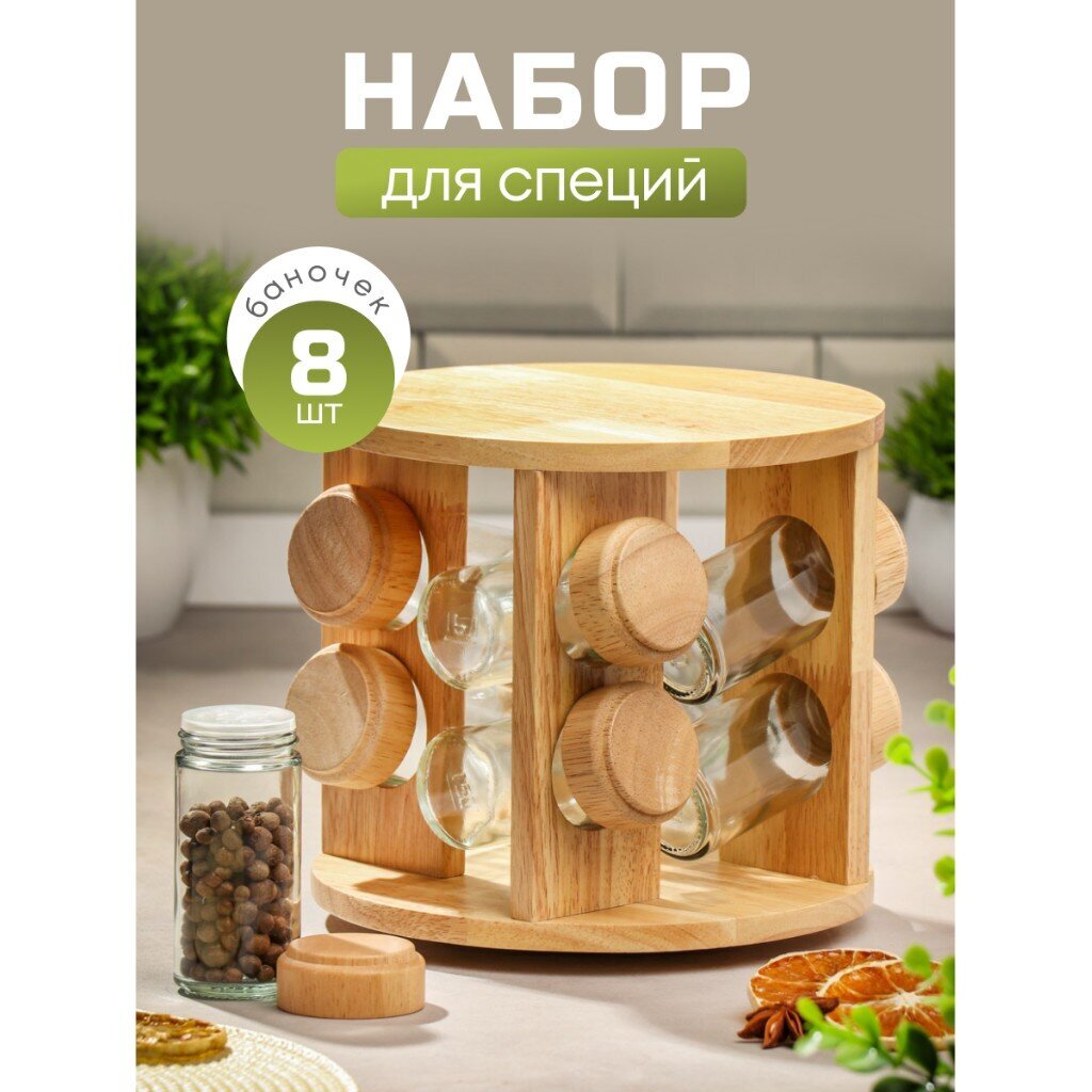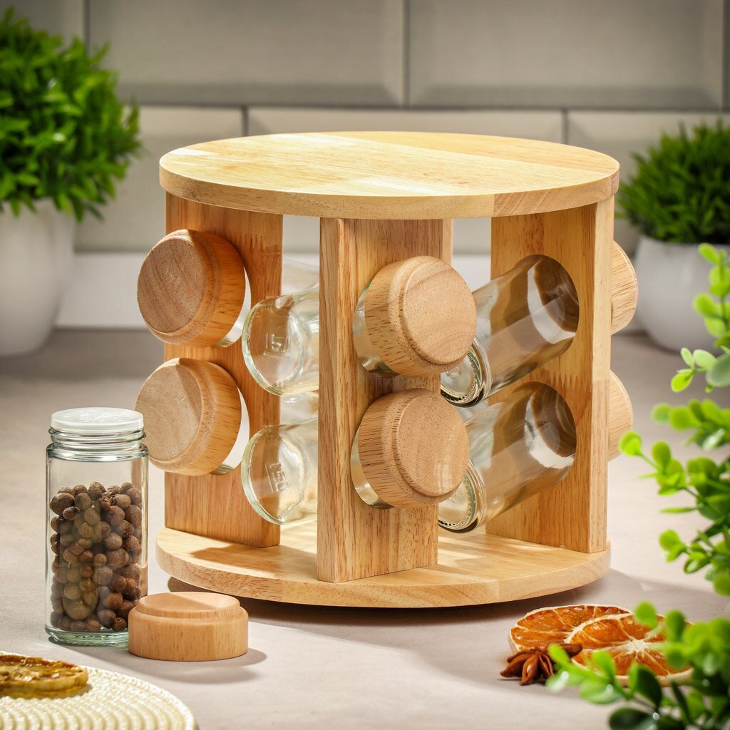 Набор для специй удобен и прост в использовании. Он вмещает 8 стеклянных банок. Емкости надолго сохранят первоначальный аромат пряностей или приправ. Модель выполнена из дерева.