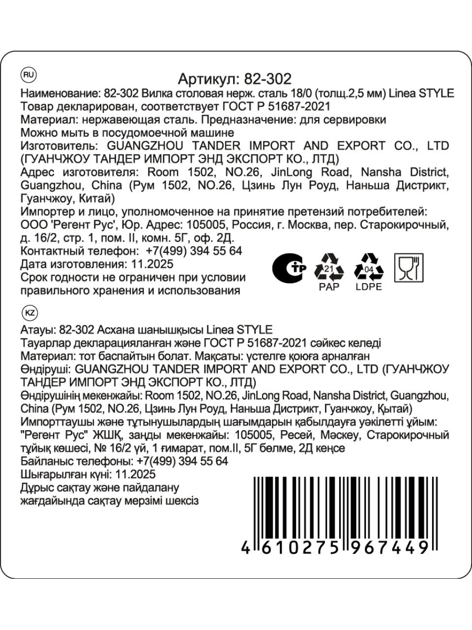 Вилка рассчитана на одного человека, выполнена в современном стиле, с металлической ручкой, без дополнительных покрытий, цвет — серебристый. Производитель — Regent Inox, модель Linea Style, артикул 82-302.