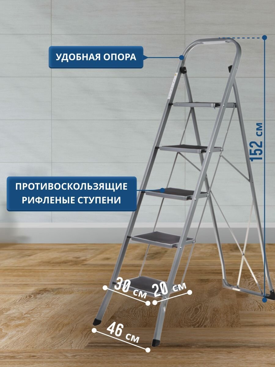 - Стремянка имеет пять ступеней, что делает ее удобной для выполнения работ на разных высотах. Вы можете легко достать до высоких полок, заменить лампочку или выполнить другие работы, не используя дополнительные инструменты.