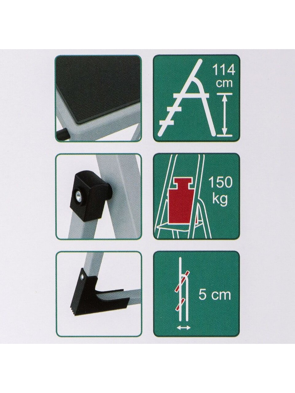 - Высокая нагрузочная способность. Стремянка может выдерживать нагрузку до 150 кг, что обеспечивает высокую степень безопасности при использовании. Вы можете спокойно стоять на ней и выполнять различные работы на высоте.