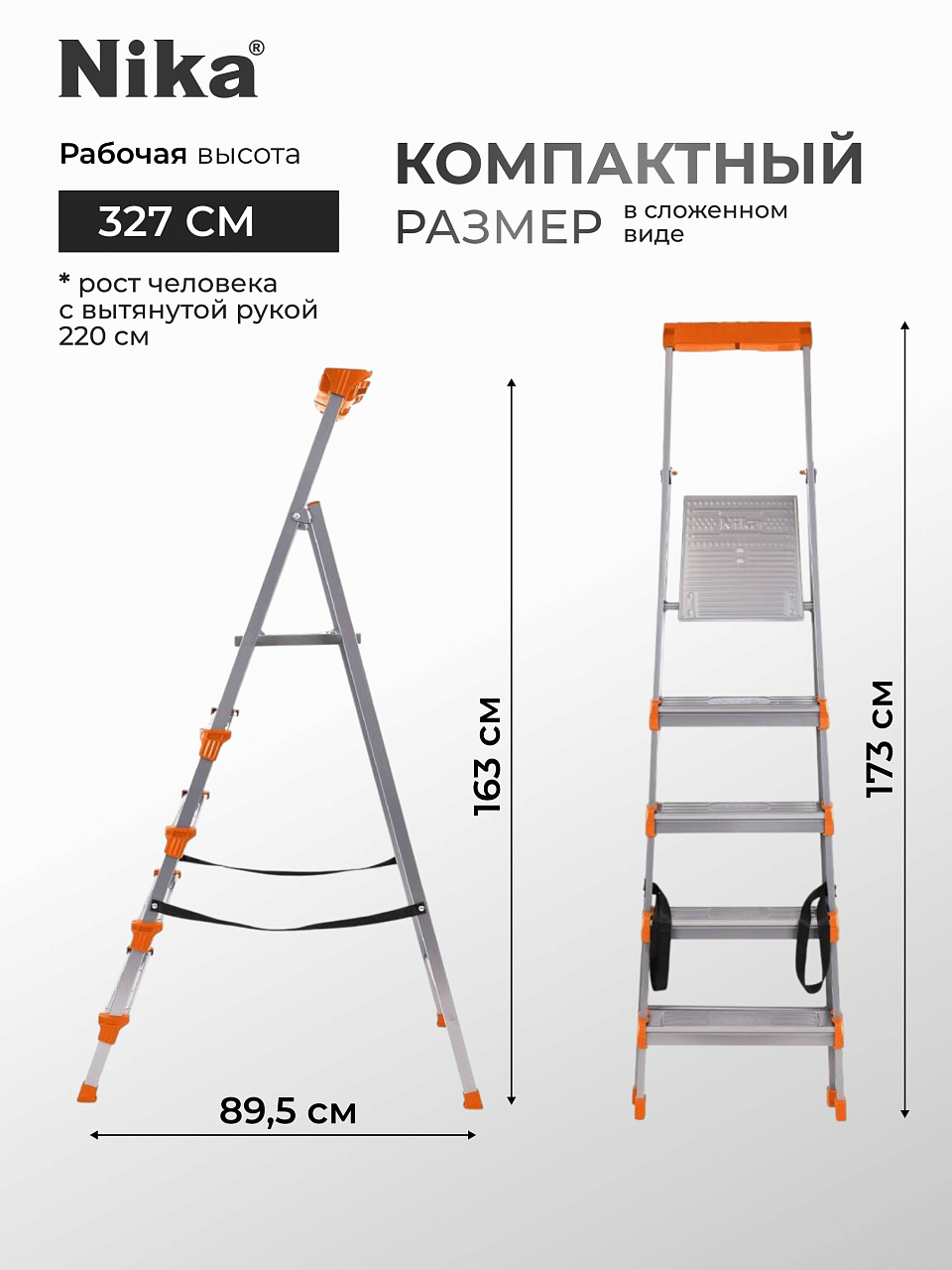 - Высота стремянки с учетом платформы в сложенном виде: 130 см.