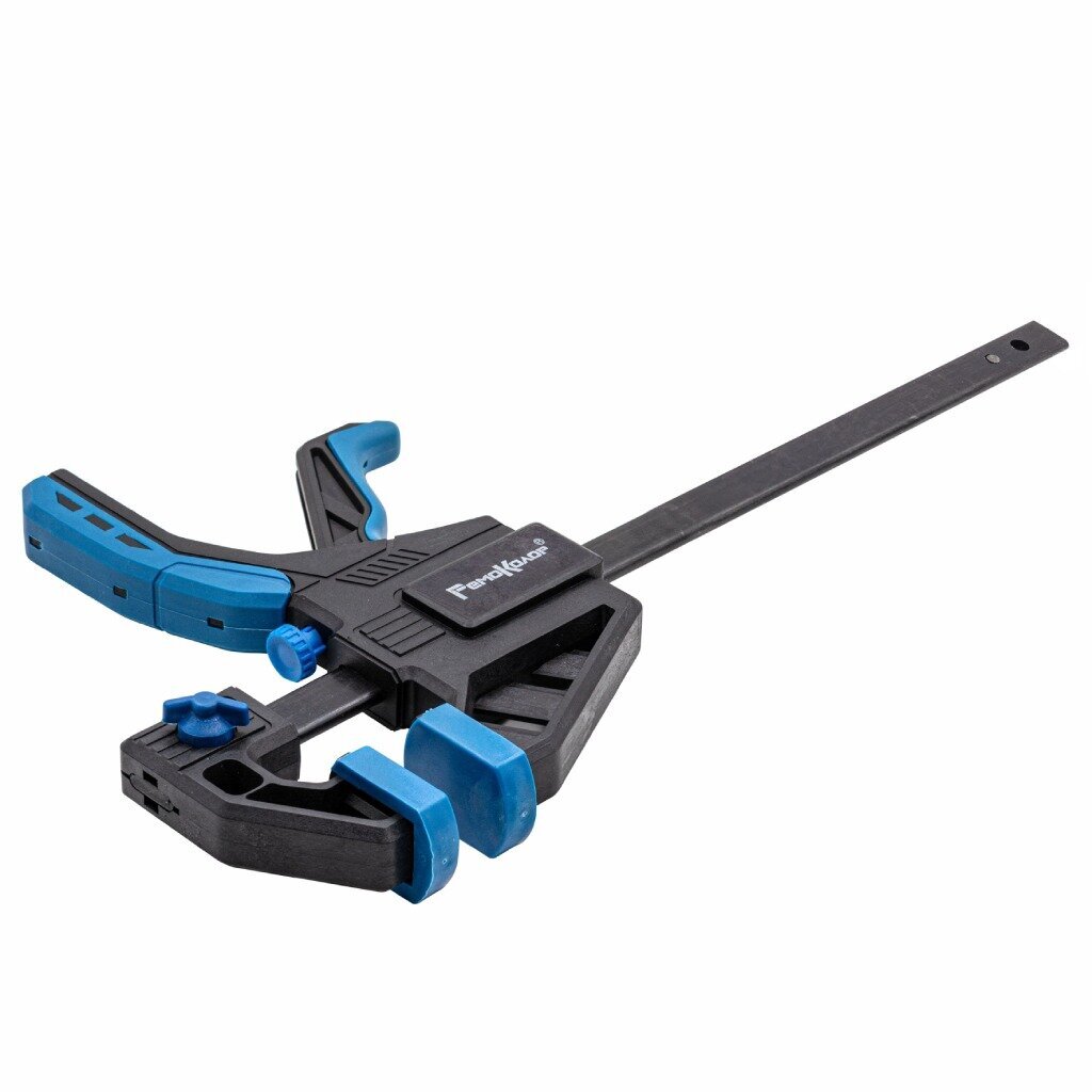 F-образная струбцина имеет вид рамы с подвижным элементом, движение которого и позволяет осуществлять фиксацию. Подобное оснащение определенно заинтересует профессионалов. Струбцина производится из качественных материалов.